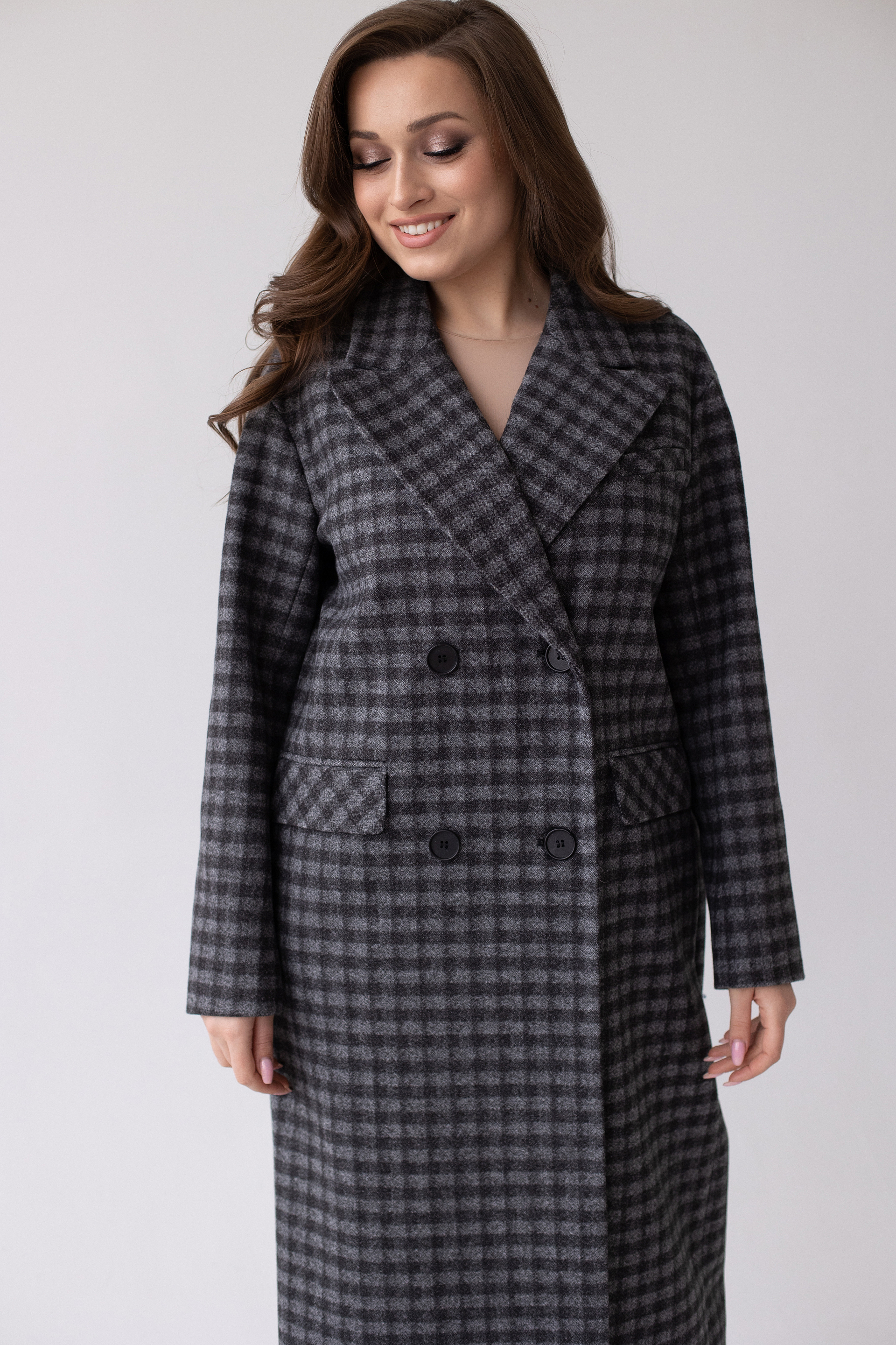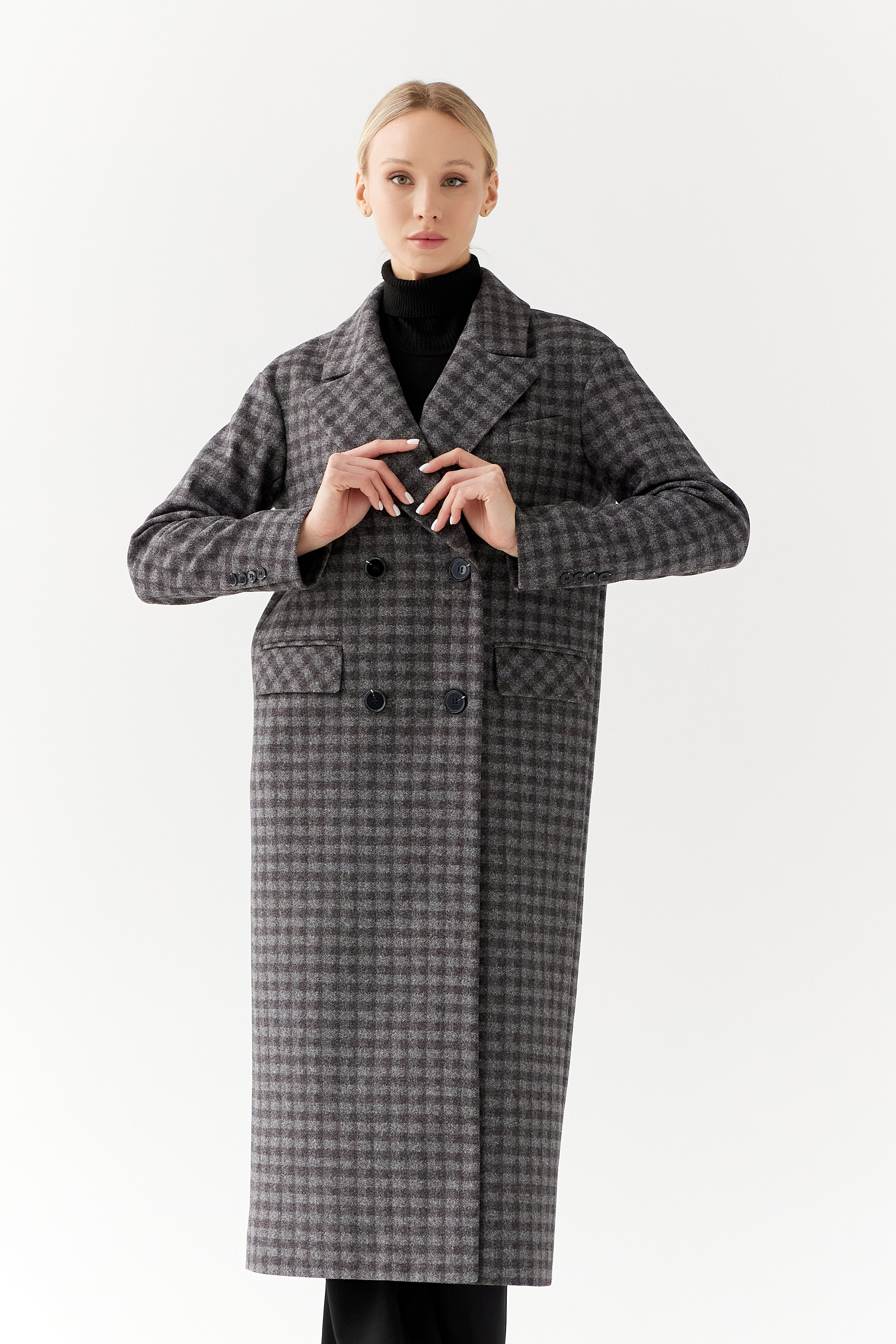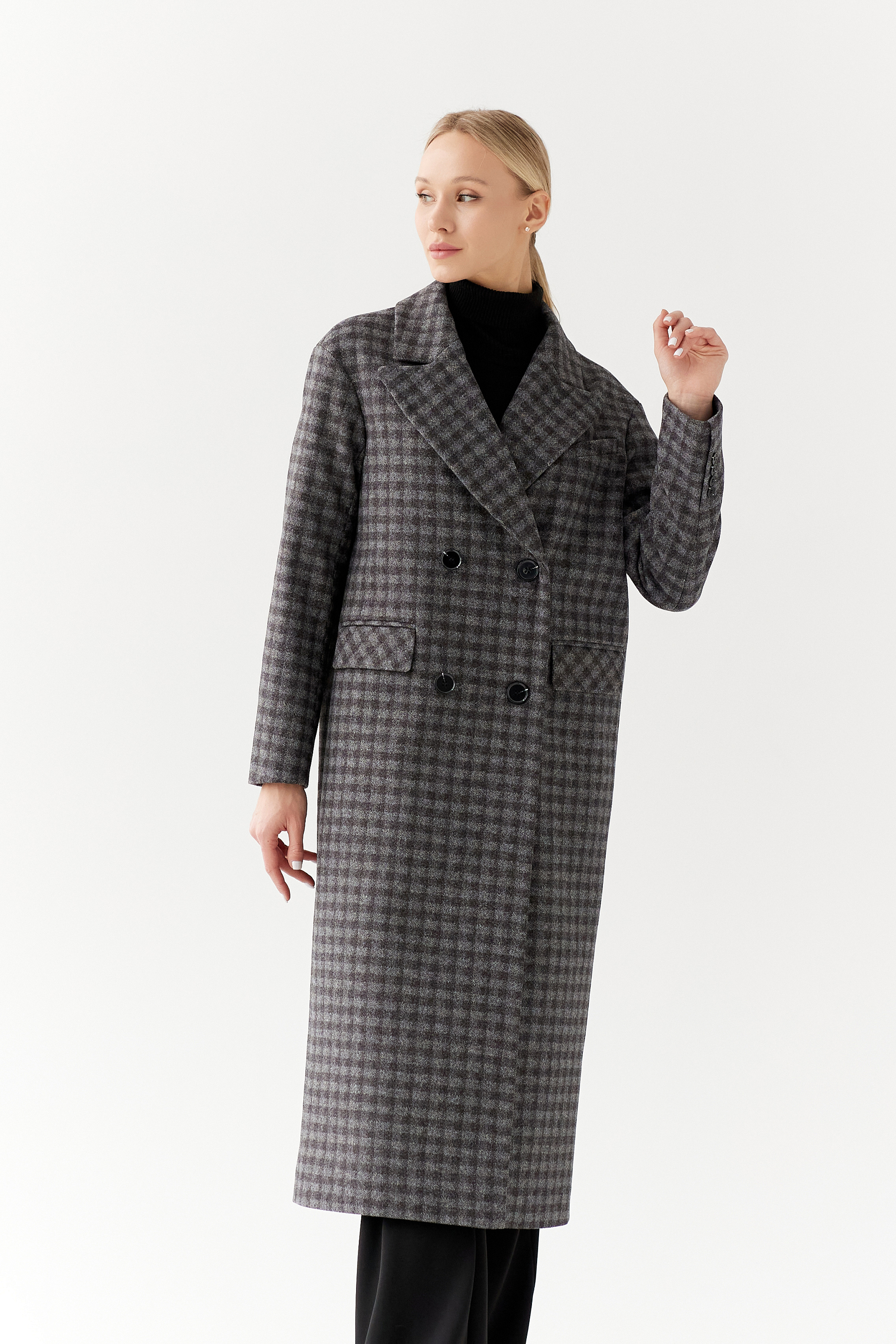 Двубортное пальто с мужским силуэтом и дополнительным объемом в плечах