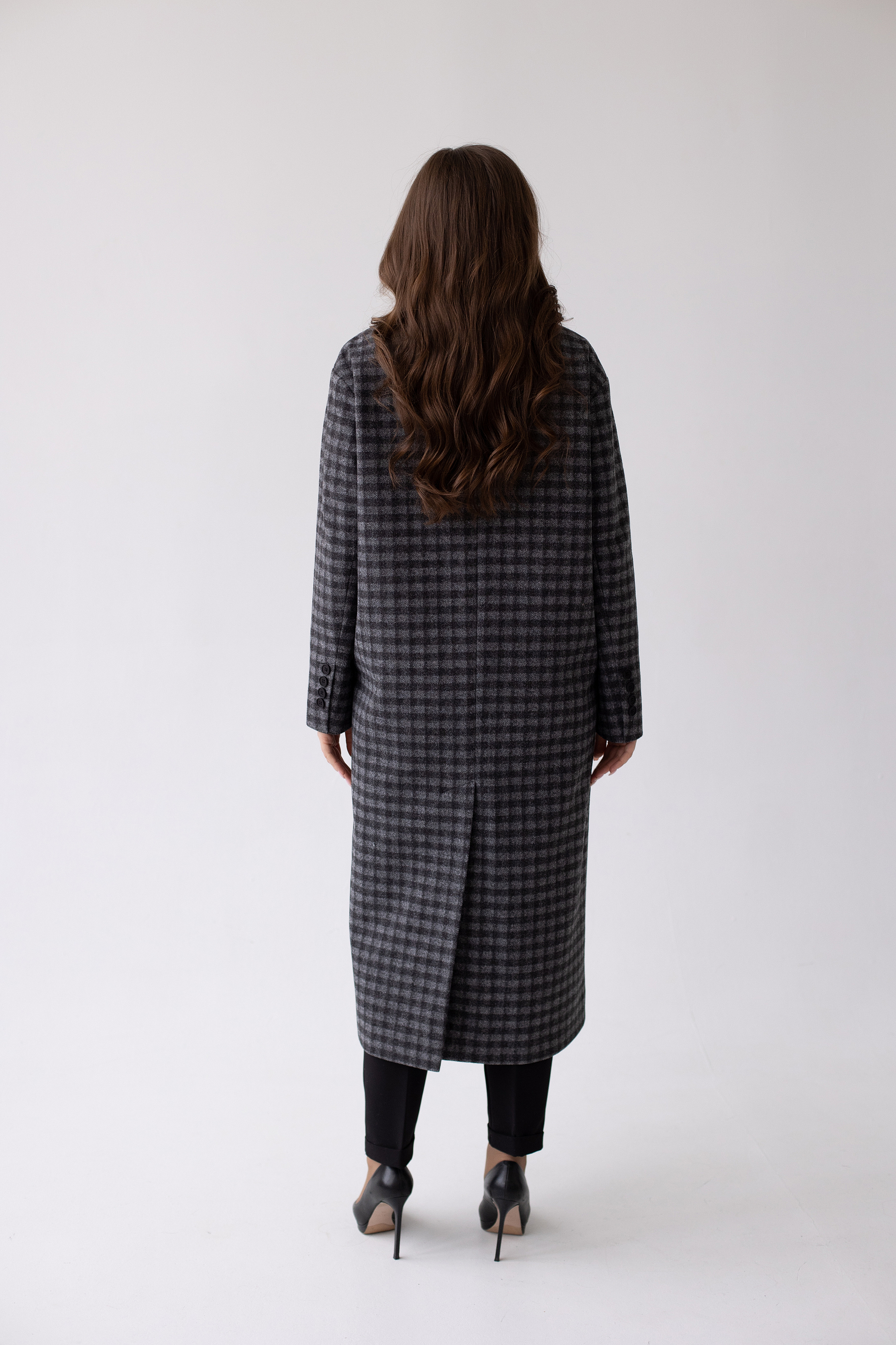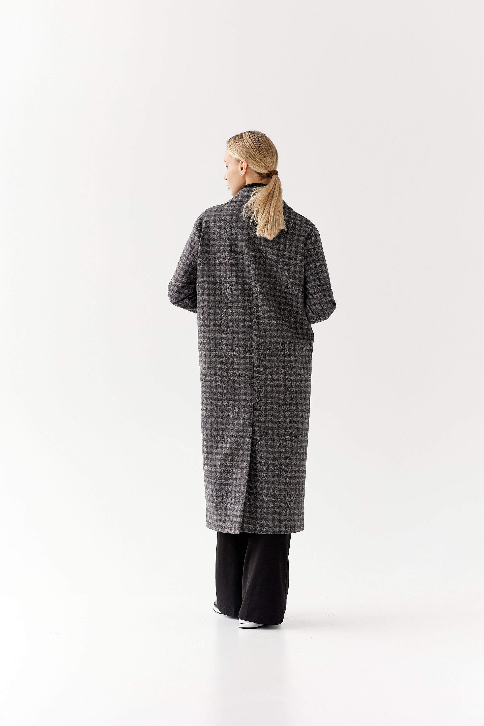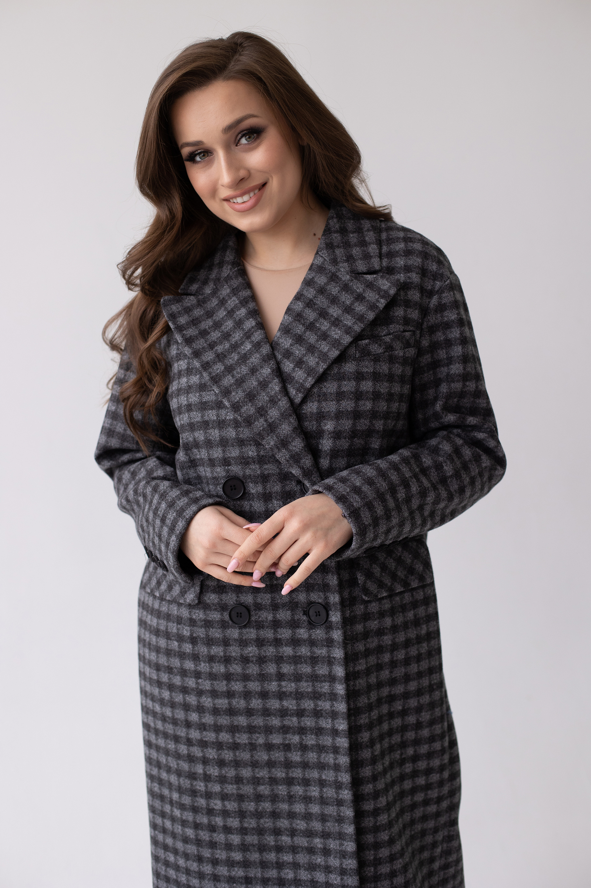 Двубортное пальто с мужским силуэтом и дополнительным объемом в плечах