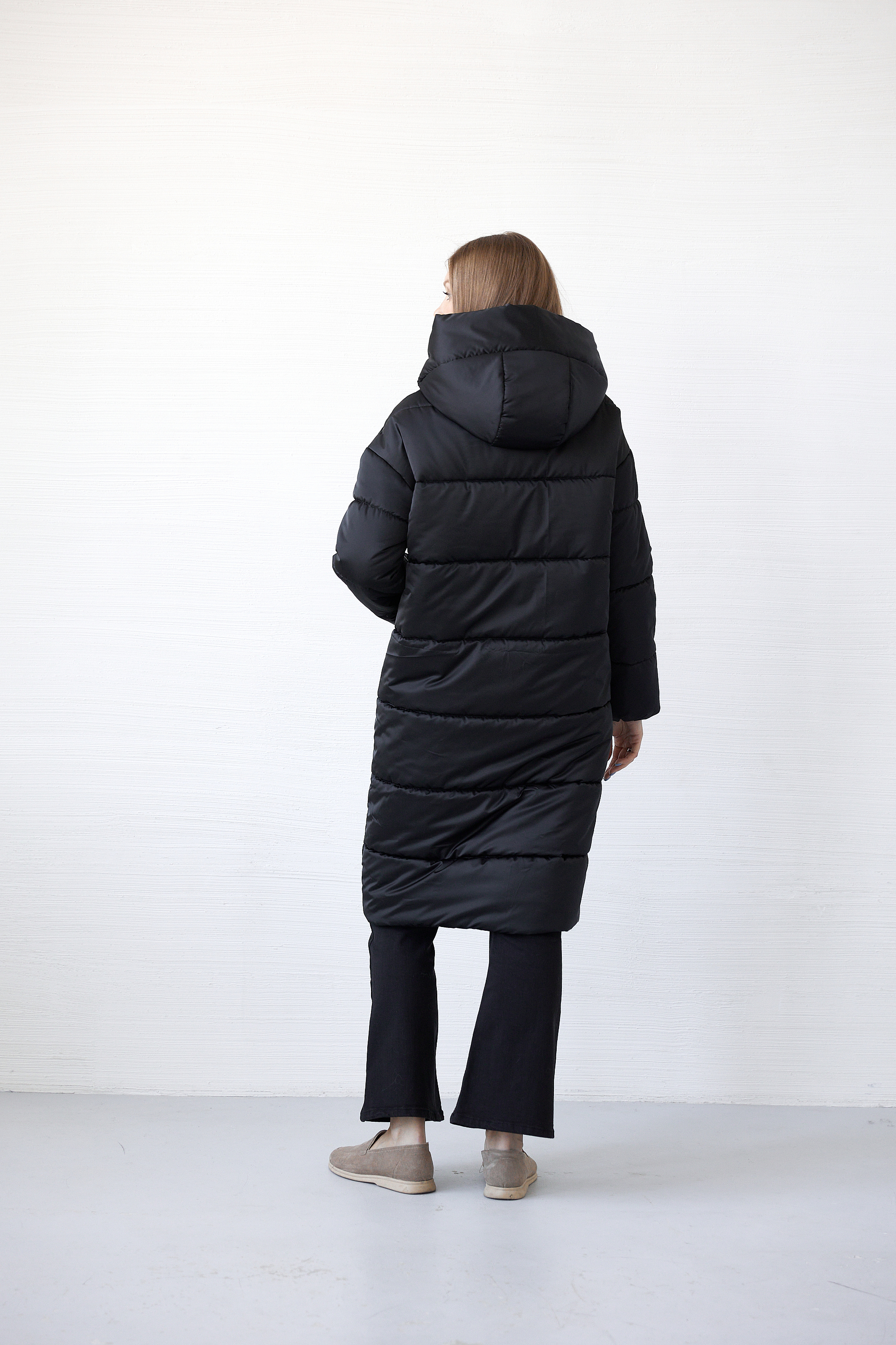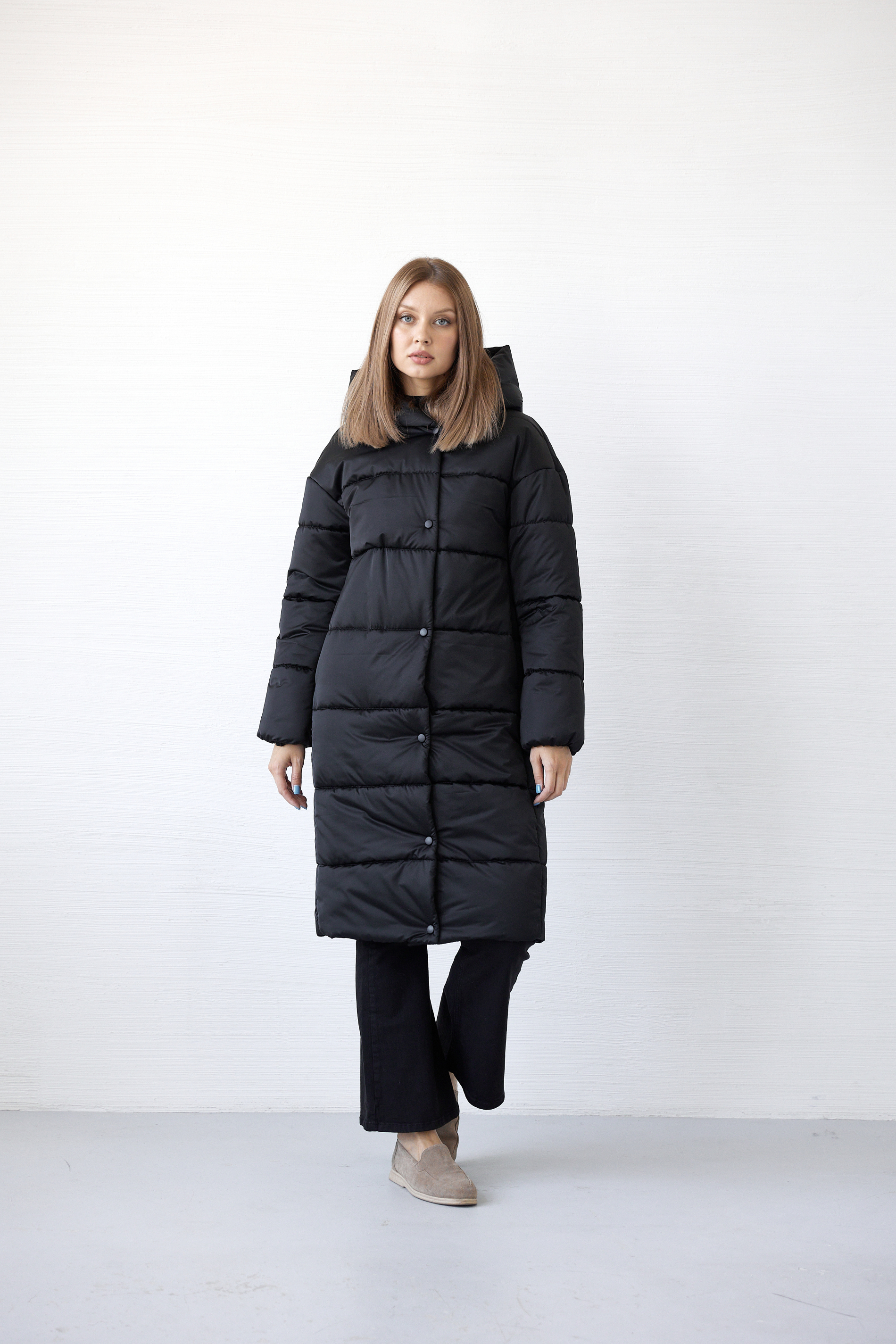 Прямой силуэт, застежка на замок-молнию и 5 пробивных кнопок