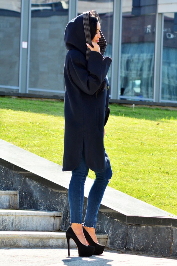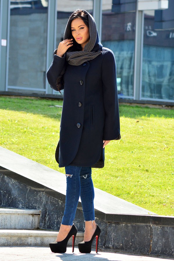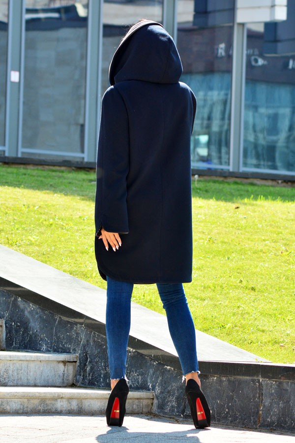 Изделие двубортное с застежкой на 4 пробивные петли и 4 пуговицы, в боковых швах закругленные разрезы.