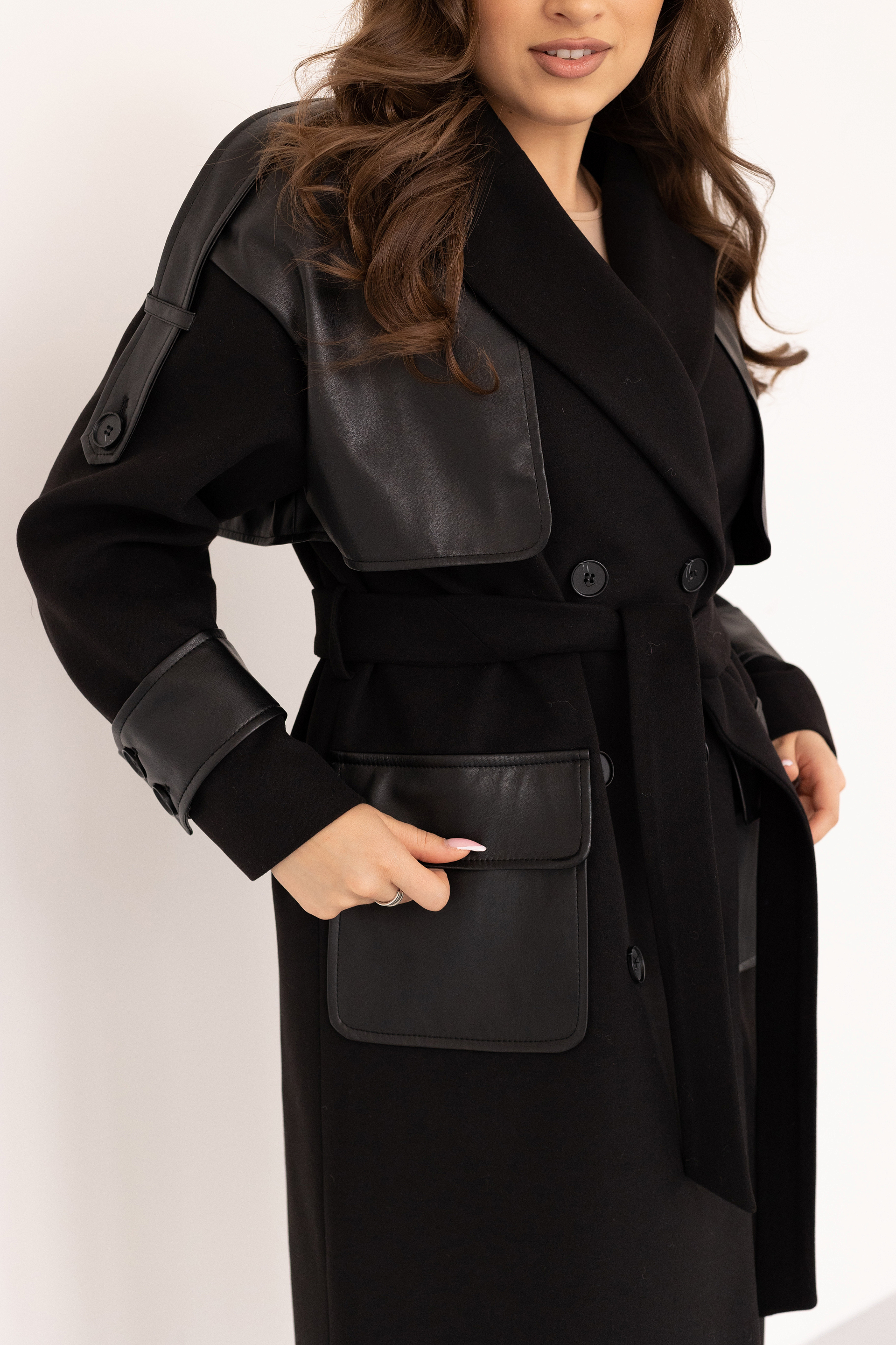 Силуэт комбинированный, свободного объема. С отлетными кокетками, погонами и широкими патами.