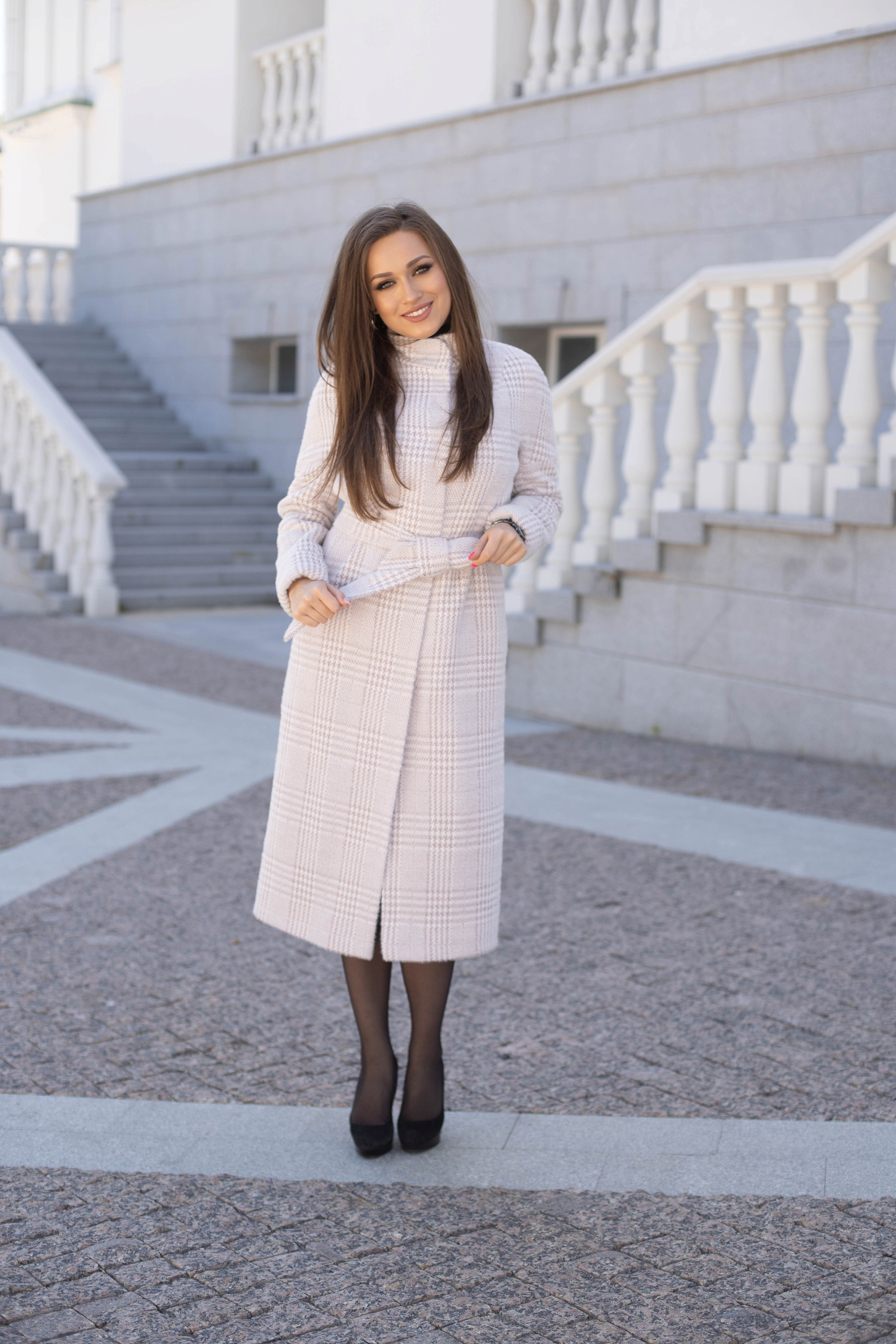 Пальто женское демисезонное 22101 (пудра/клетка)