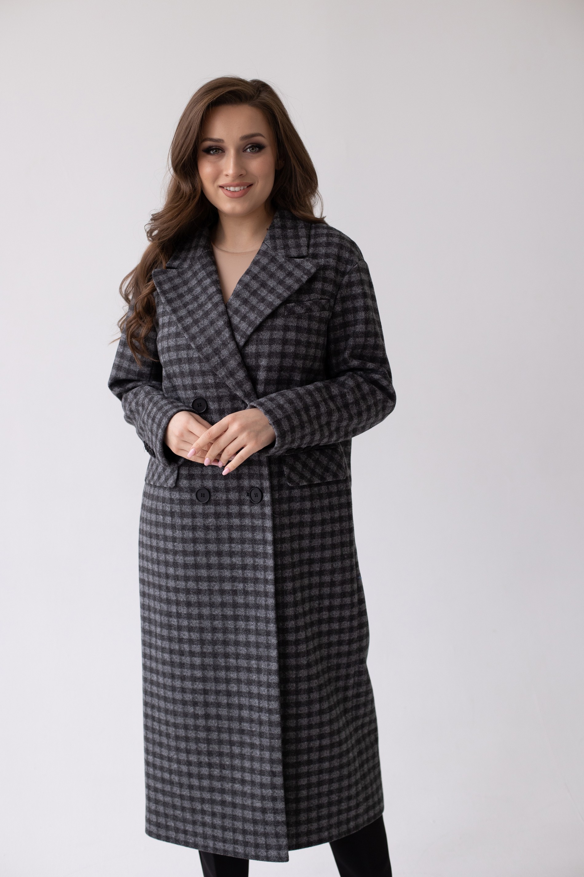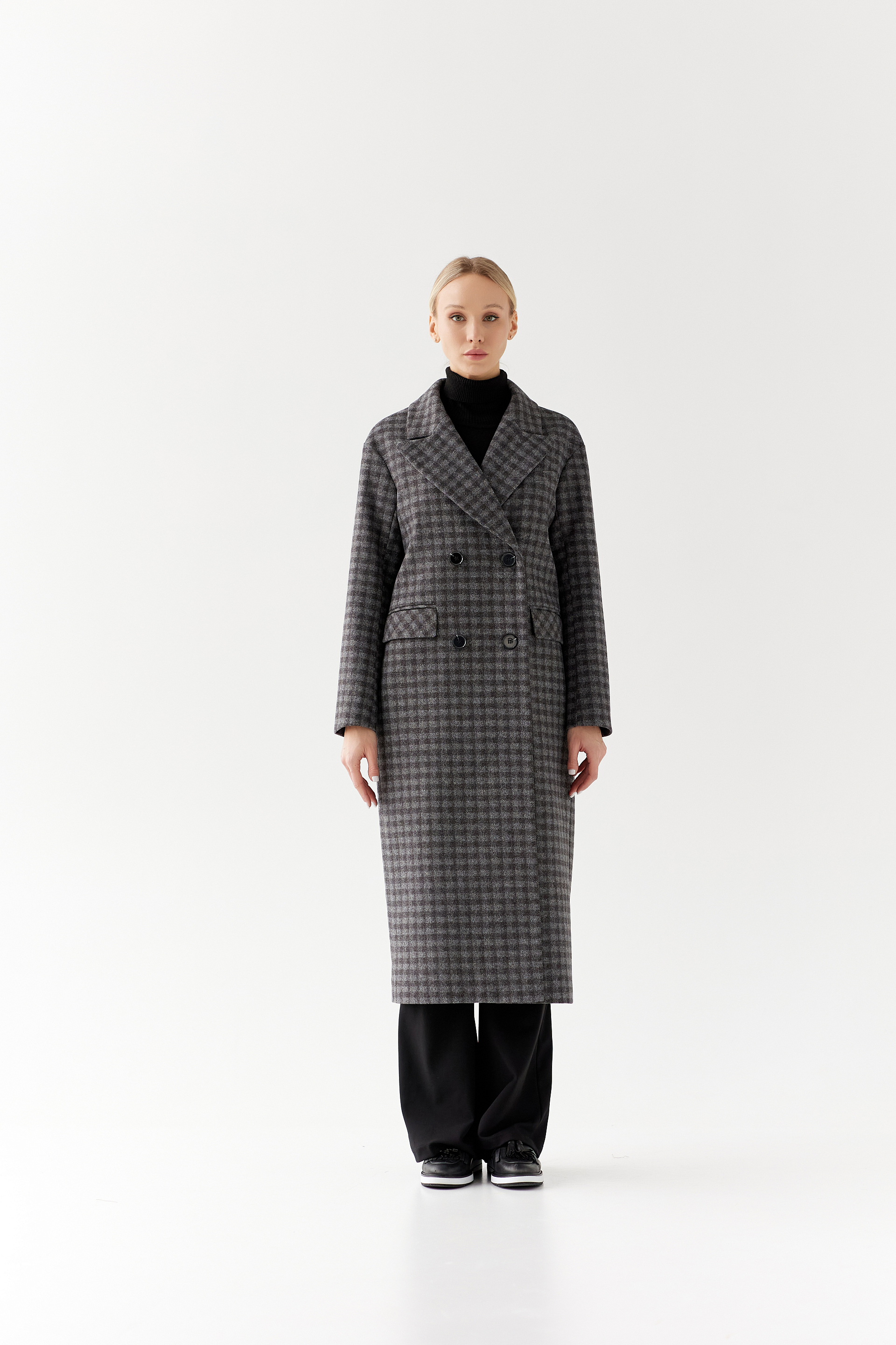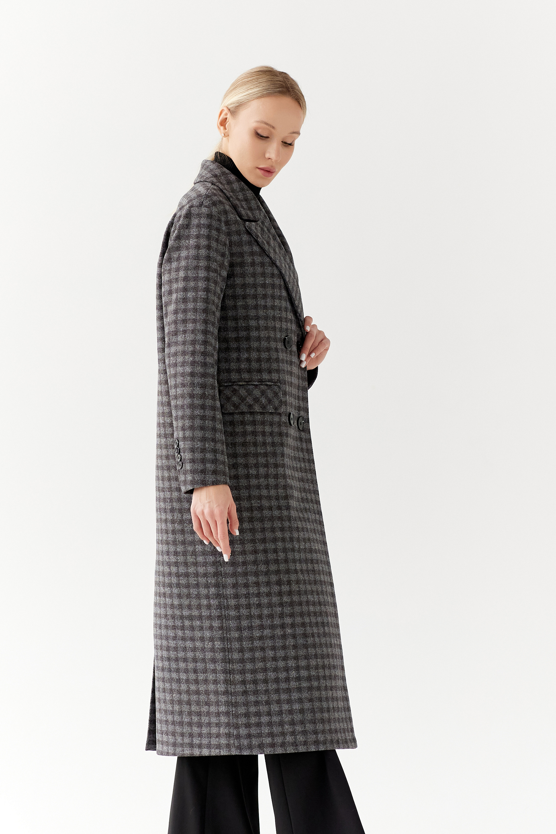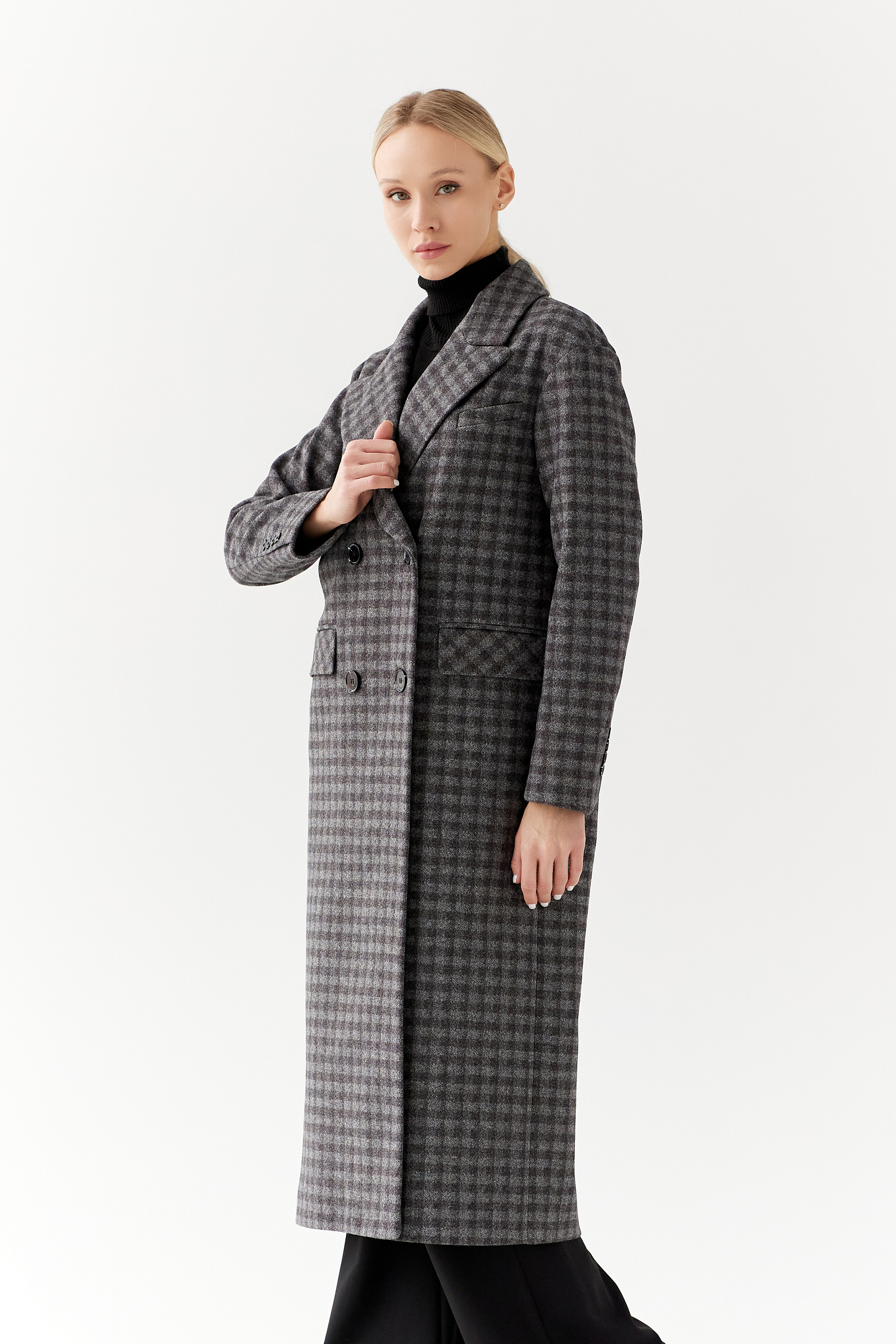 Двубортное пальто с мужским силуэтом и дополнительным объемом в плечах