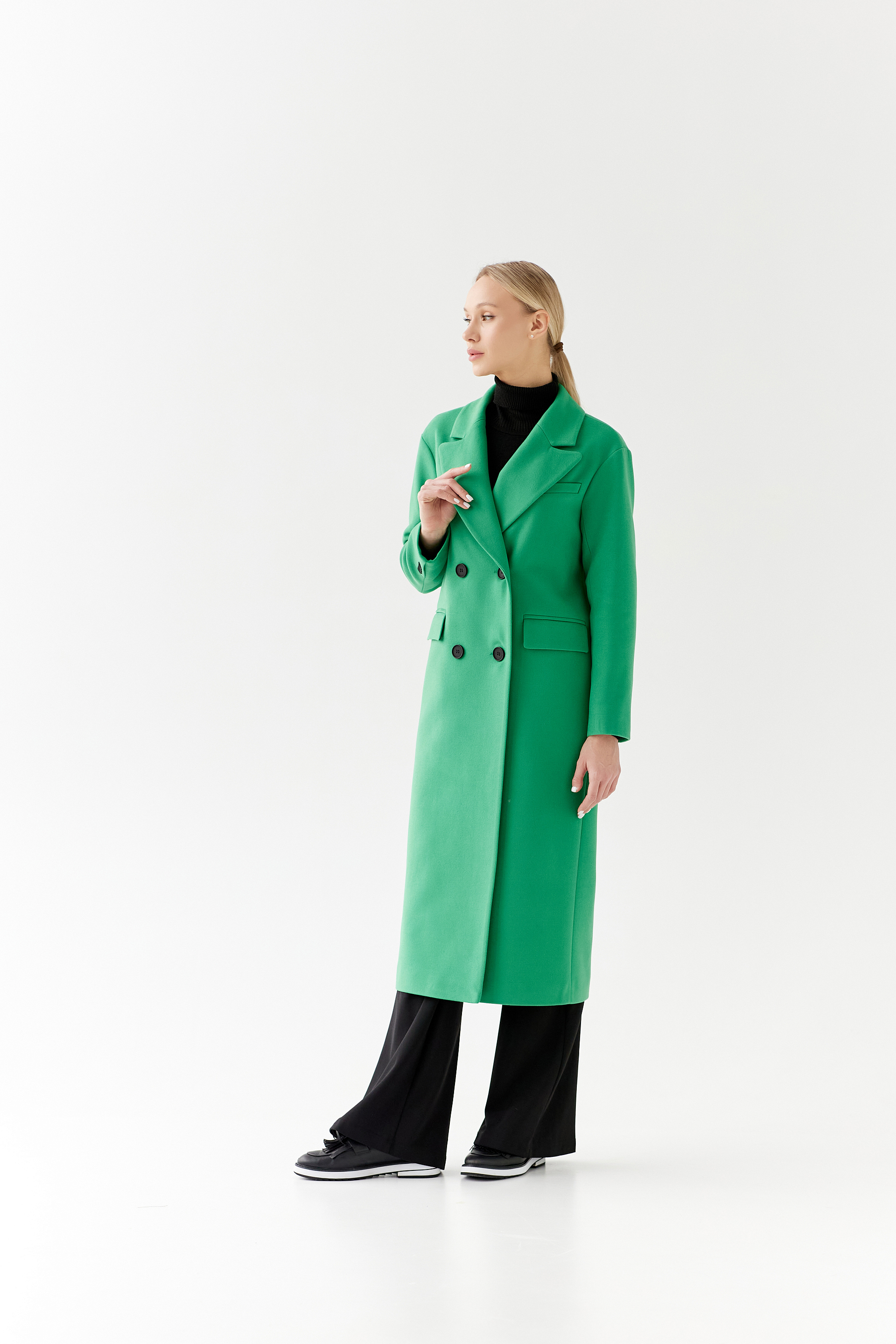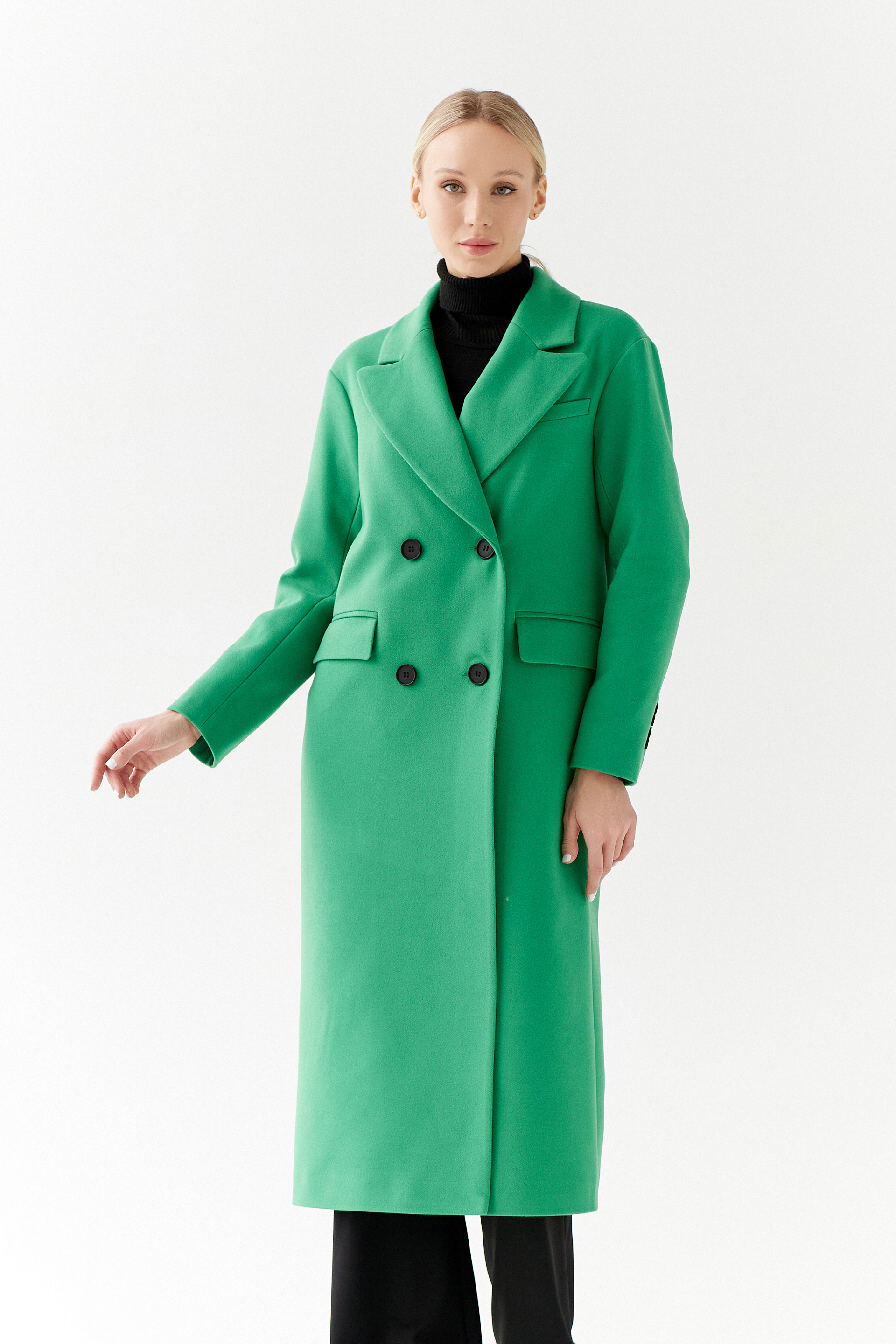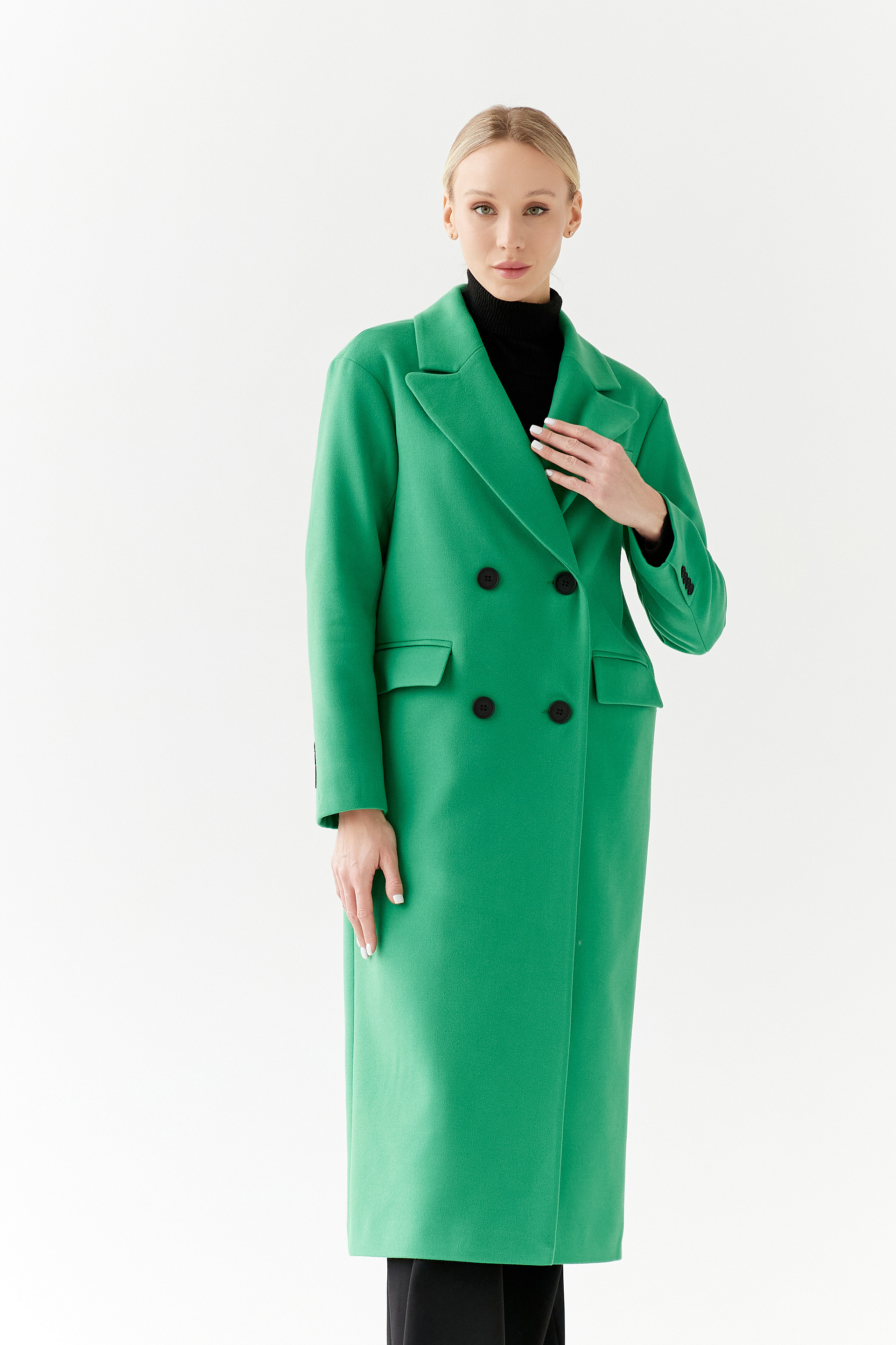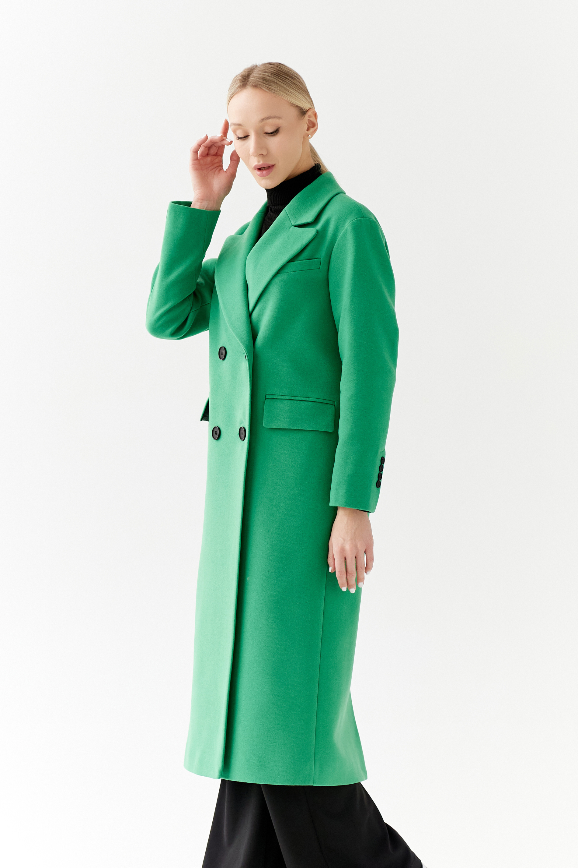 Двубортное пальто с мужским силуэтом и дополнительным объемом в плечах