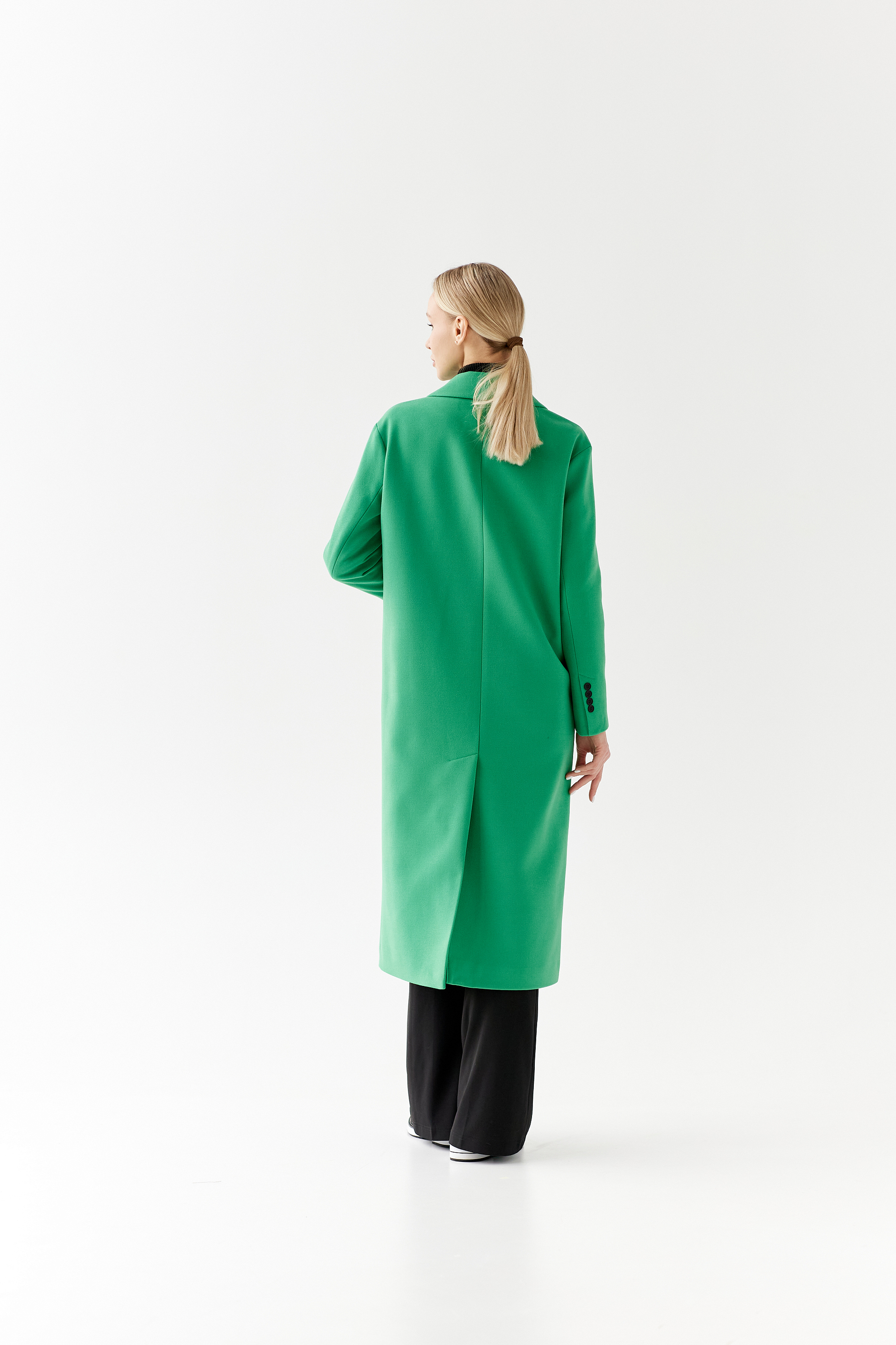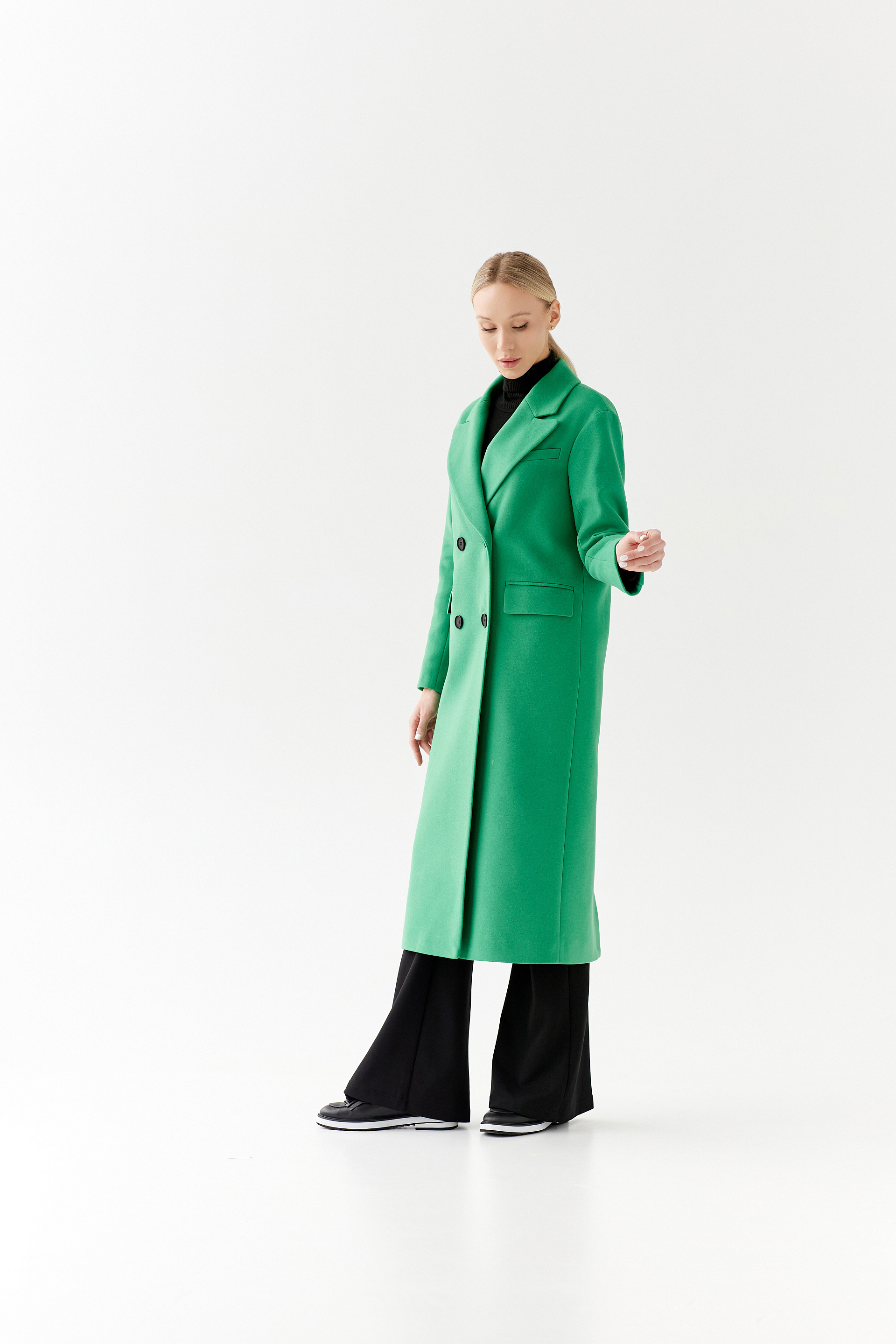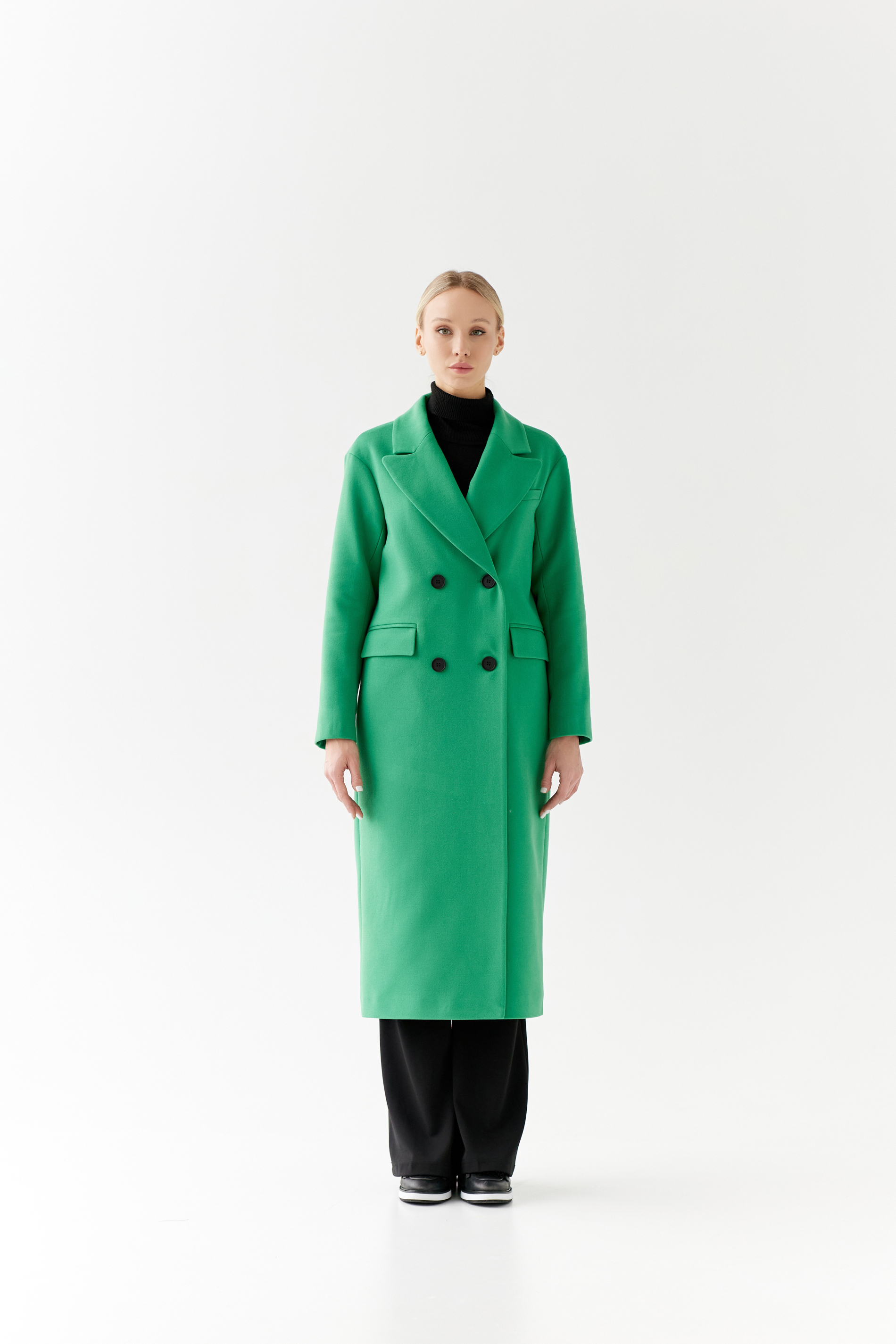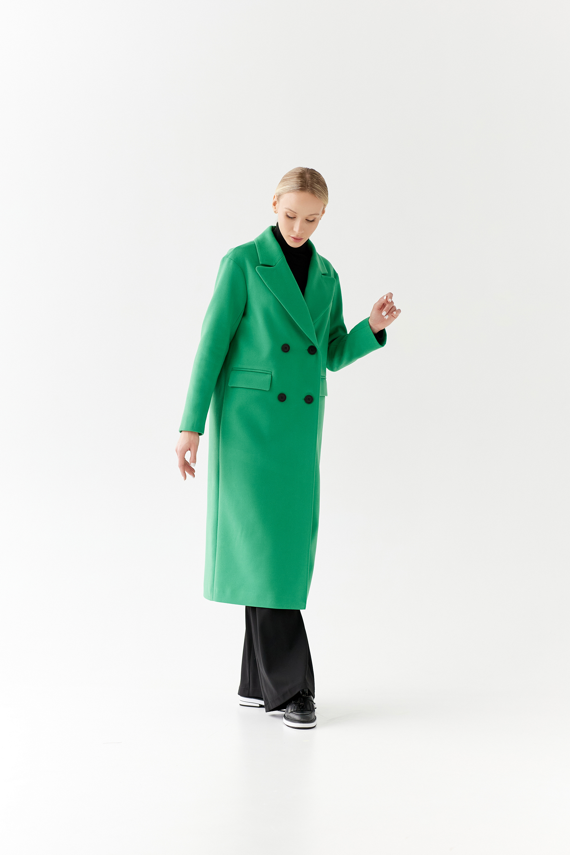 Двубортное пальто с мужским силуэтом и дополнительным объемом в плечах