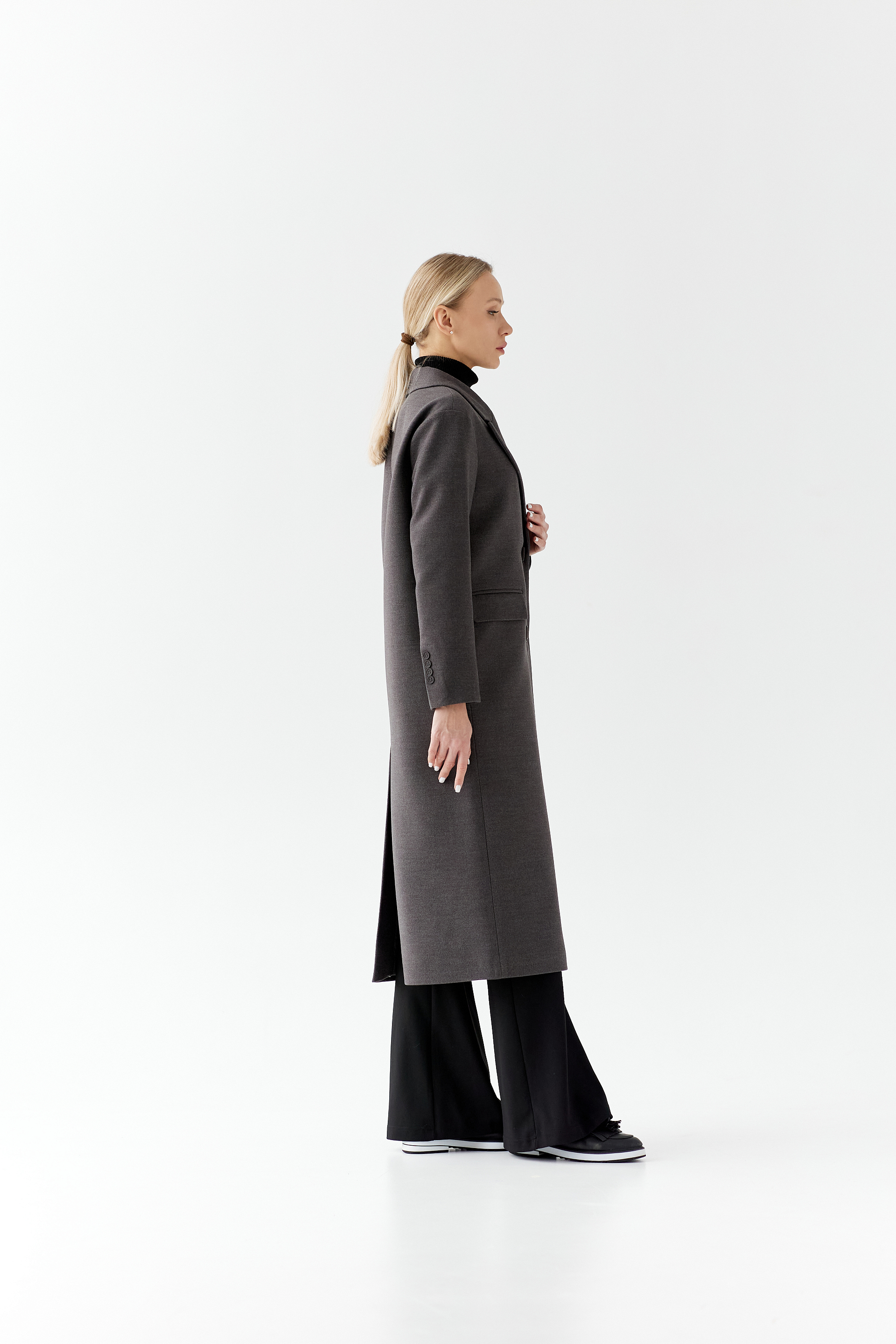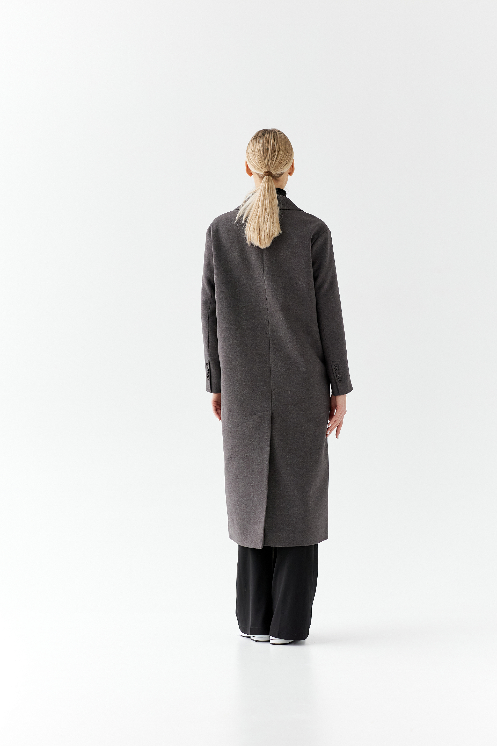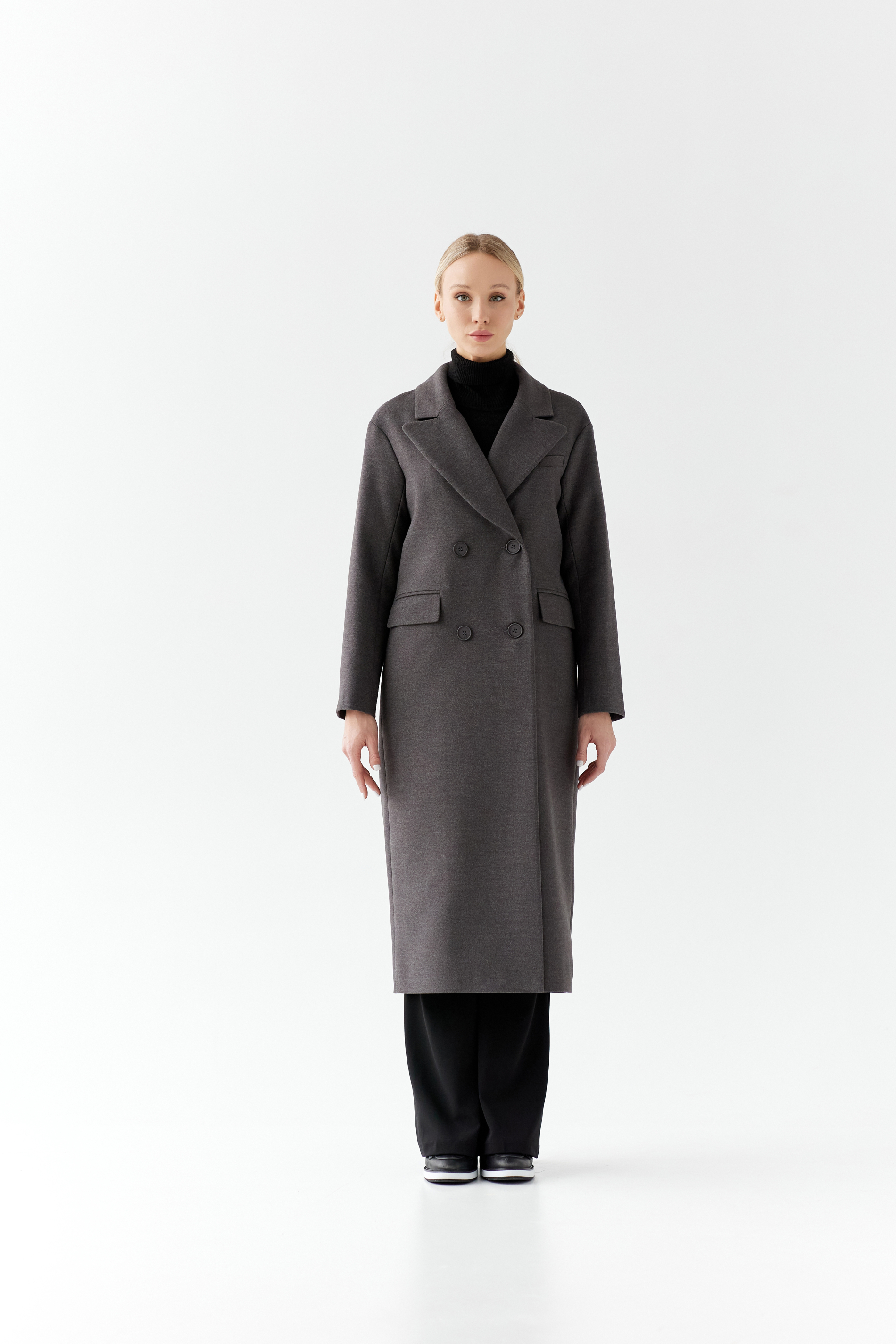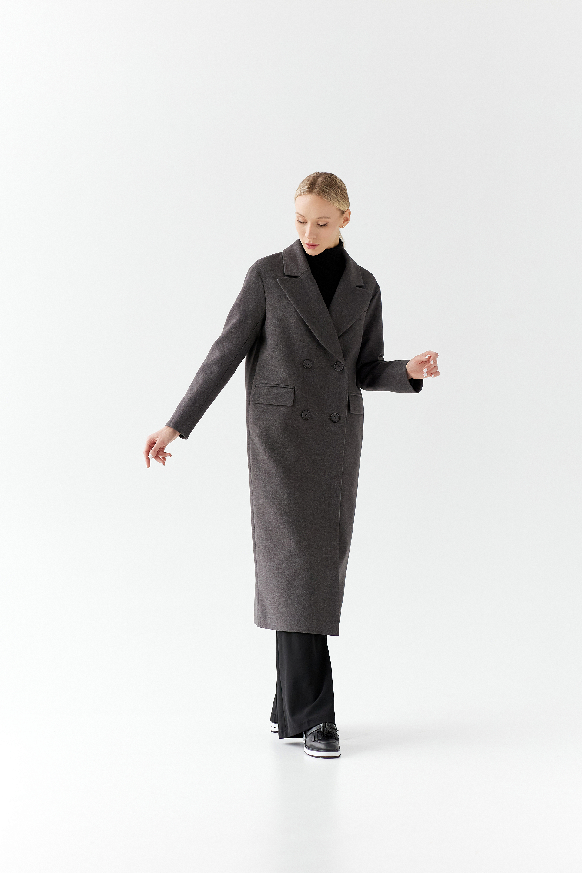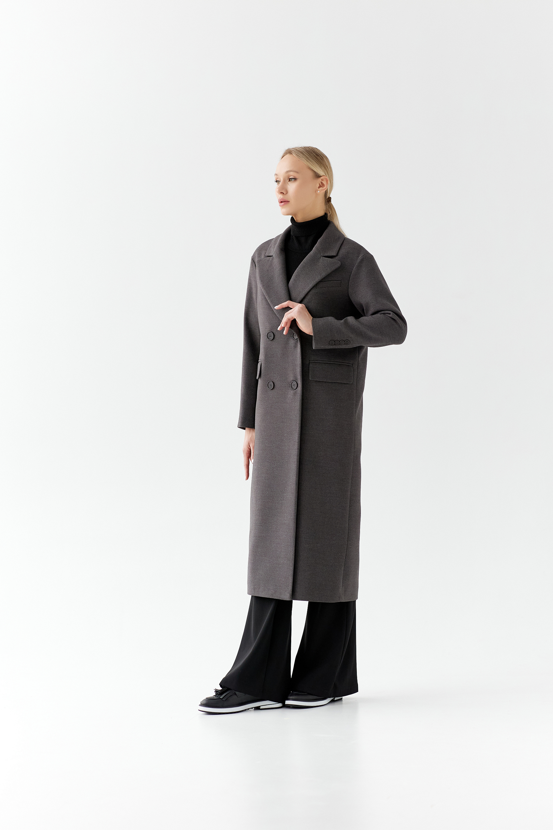 Двубортное пальто с мужским силуэтом и дополнительным объемом в плечах
