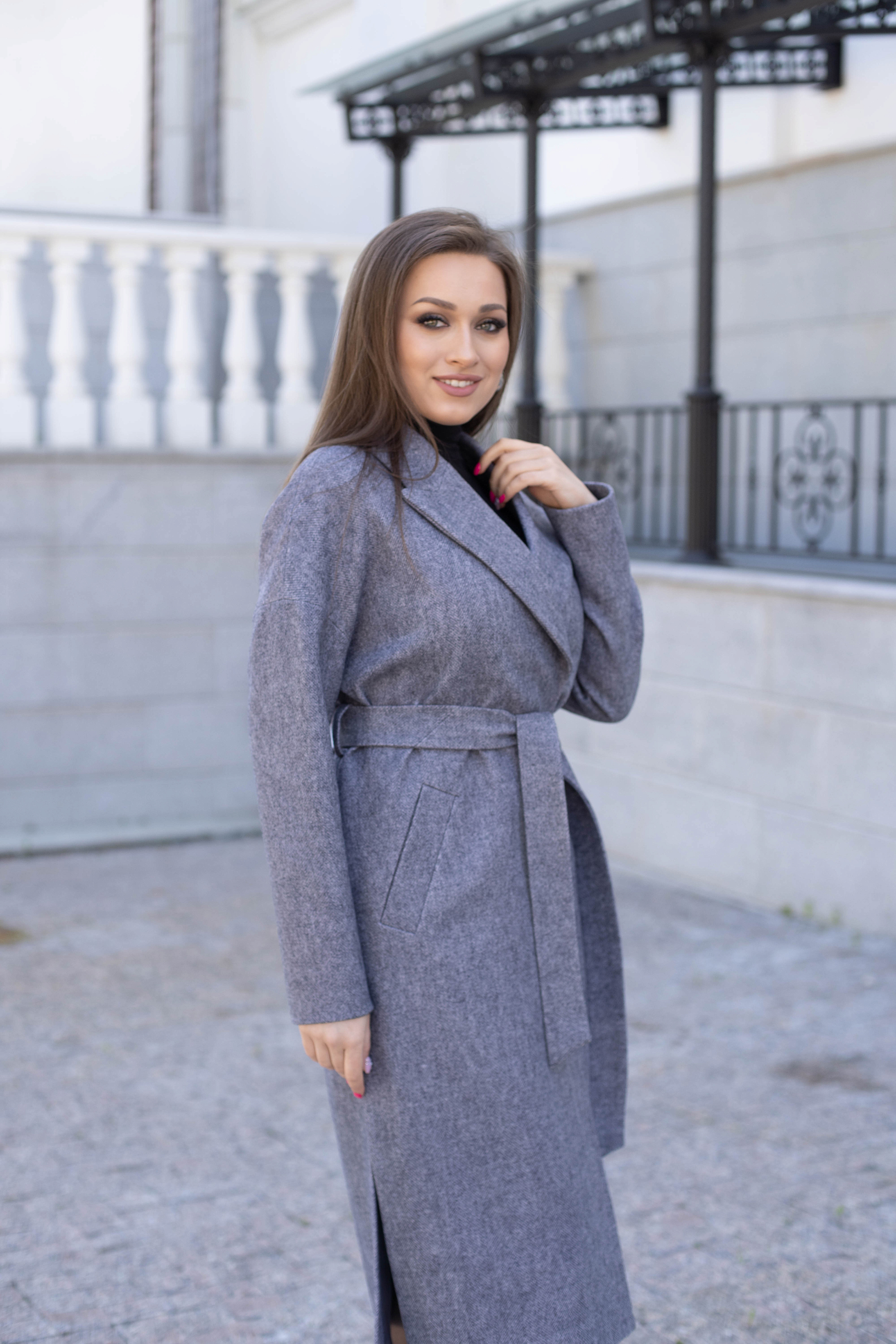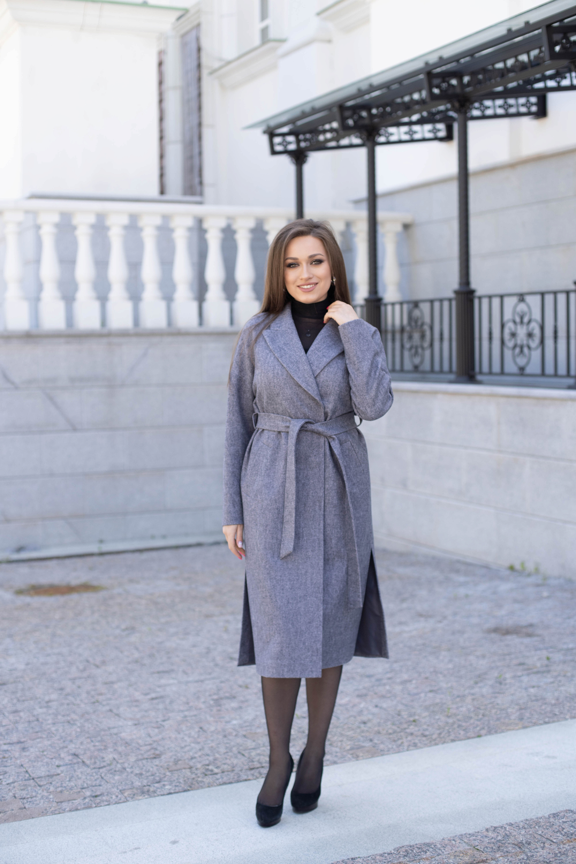 В боковых швах разрезы и шлевки под пояс.