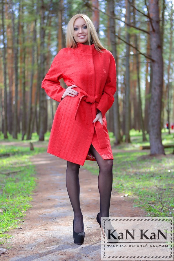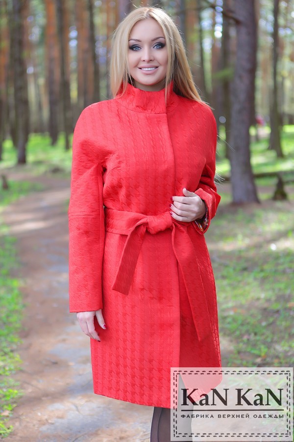 Летнее пальто из жаккарда прямой силуэт пояс (красный)