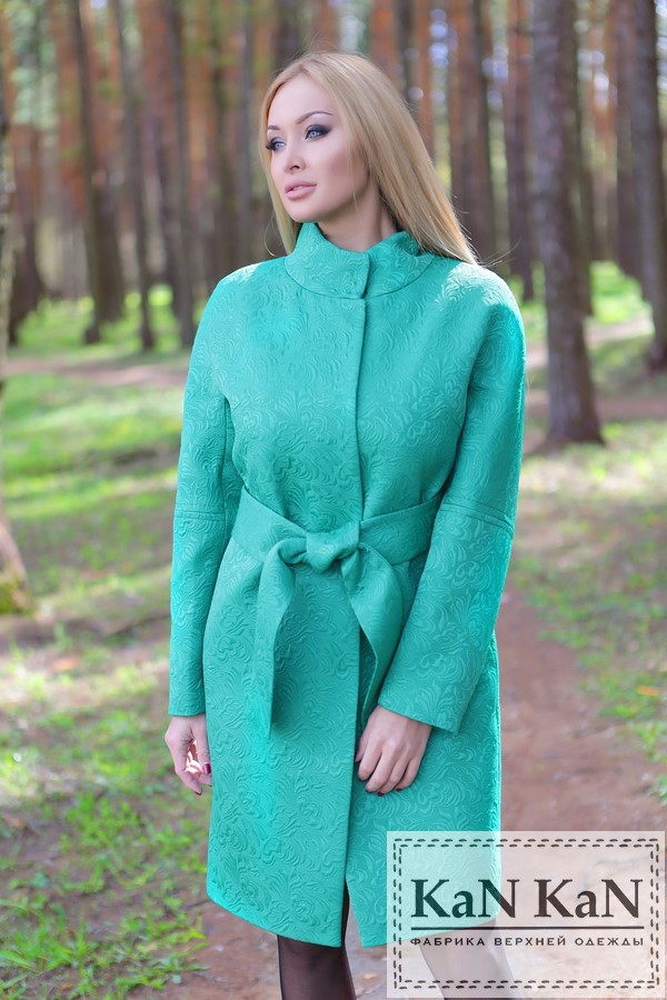 Летнее пальто из жаккарда прямой силуэт пояс (зеленый)