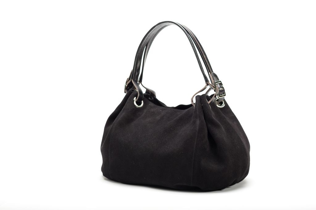 Большая кожаная сумка-мешок, мягкой округлой формы. Сумка выполнена из натуральной кожи Теральди с открытым срезом  и из натуральной замши на передней и задней стенке. Очень вместительная(формат А4). По верху закрывается на молнию, а так же на задней стенке имеет карман на молнии. Имеет овальное широкое дно.  По низу изделия предусмотрены декоративные складки. По верху сумка так же собирается складками с помощью ручек  и люверсов. Имеет две ручки с пряжками. Ручки для ношения в руке, на сгибе локтя, на плече. Внутри имеет одно основное отделение, карман на молнии и карман для мелочи. Ручка-ремень в комплекте не предусмотрен.