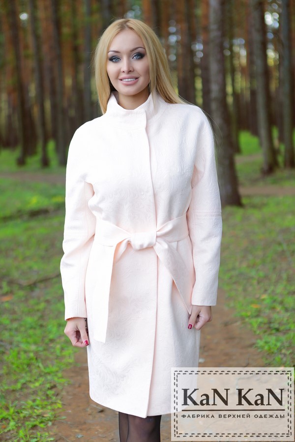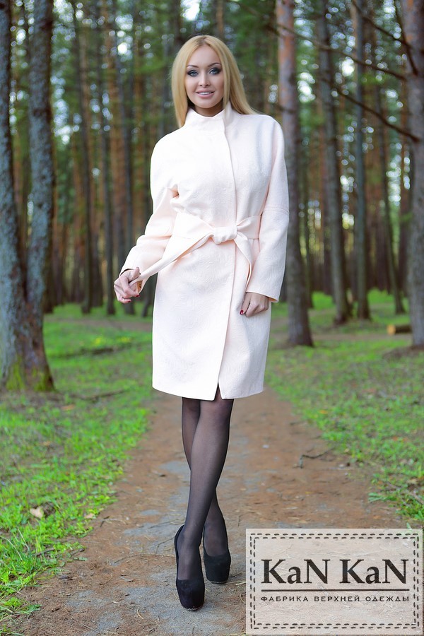 Летнее пальто из жаккарда прямой силуэт пояс (пудра)