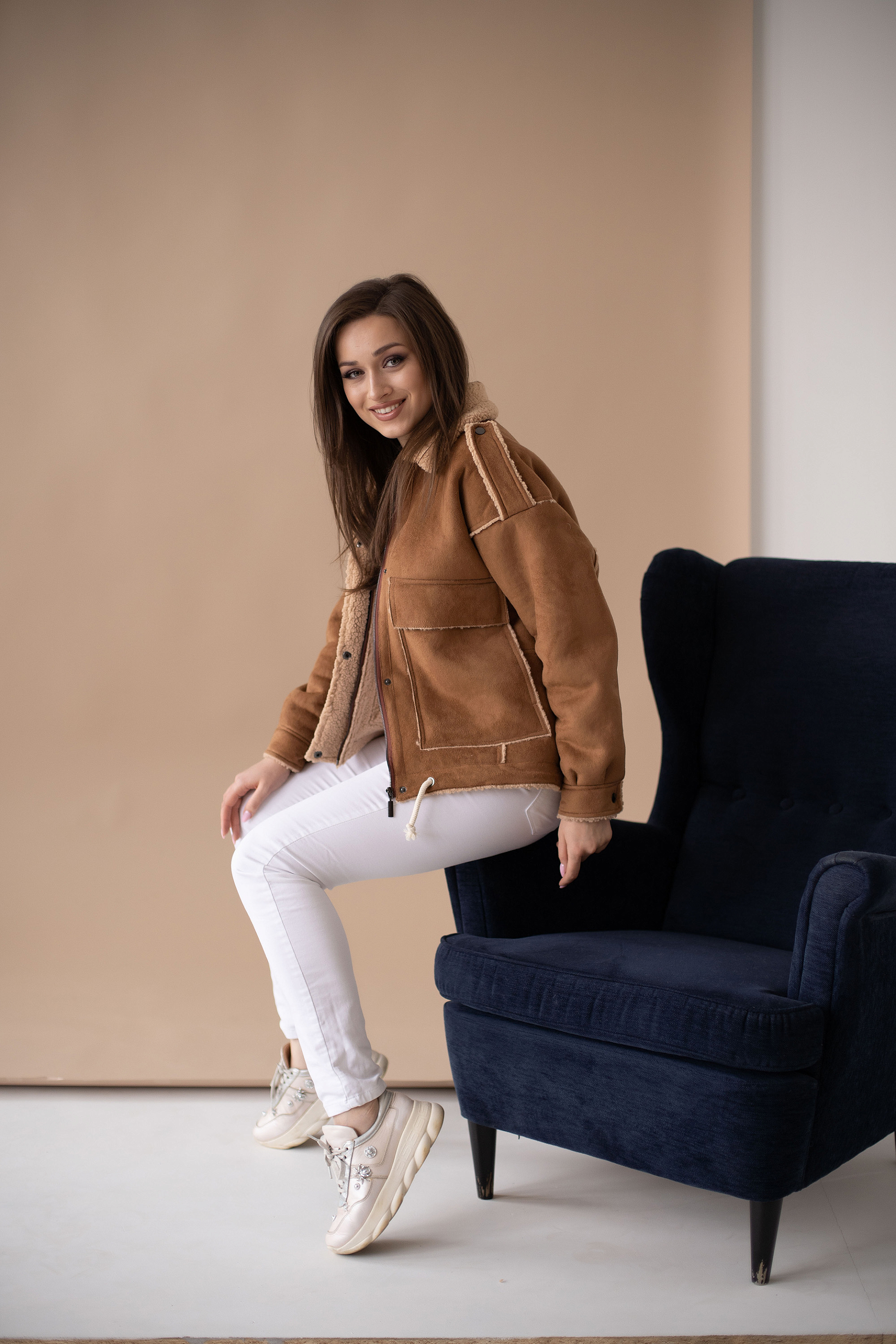Силуэт оверсайз со спущенным плечом. Застежка на молнию, закрытая планкой с пробивными кнопками.