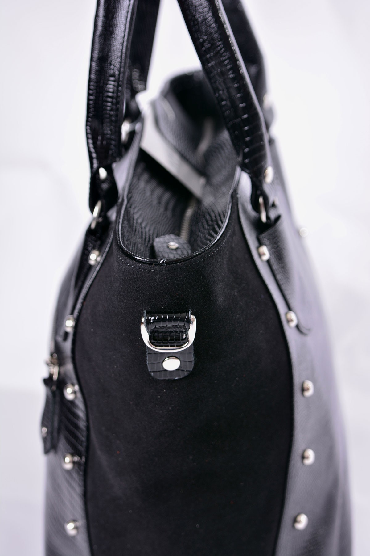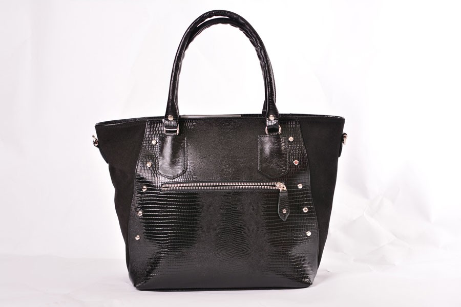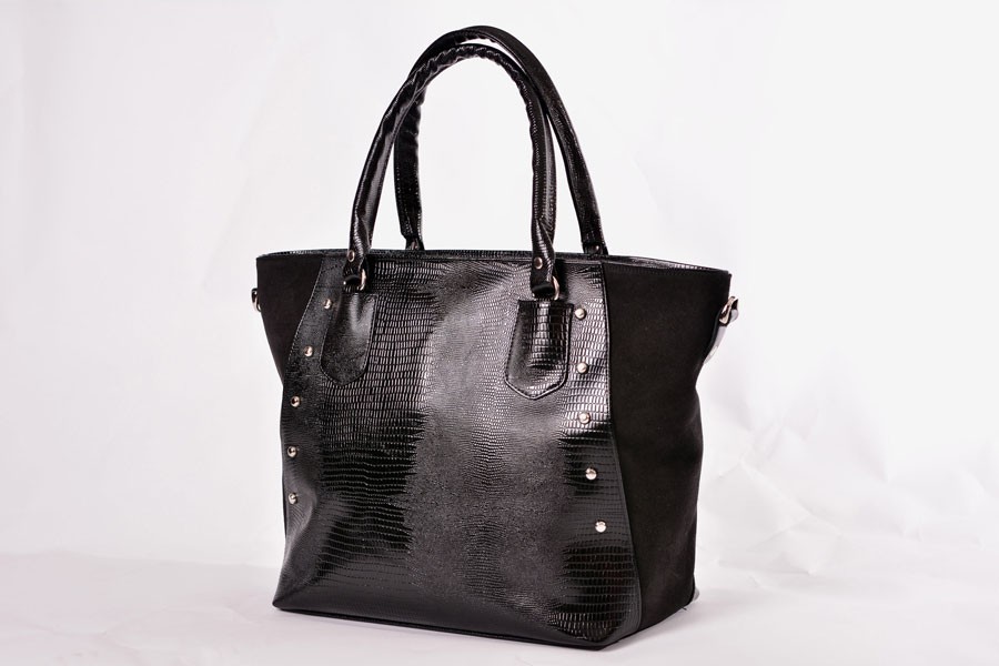 Большая  женская сумка трапециевидной формы, расширяющаяся к верху. Вмещает в себя формат А4. По верху закрывается на молнию, а так же карман на молнии на задней стенке. Имеет ручки на кольцах, которые подходят для ношения в руке, на плече, на сгибе локтя. Длина ручки – 47 см. Внутри имеет одно основное отделение,  карман на молнии, карман-перегородку на молнии. Сумка выполнена в натуральной коже с тиснением под рептилию. Скомбинирована с натуральной замшей по боковым сторонам сумки.  Украшена фигурными ручко-держателями и декоративными клепками на передней и задней стенке. В комплект входит длинный ручка-ремень. Его максимальная длина – 1м 20см.