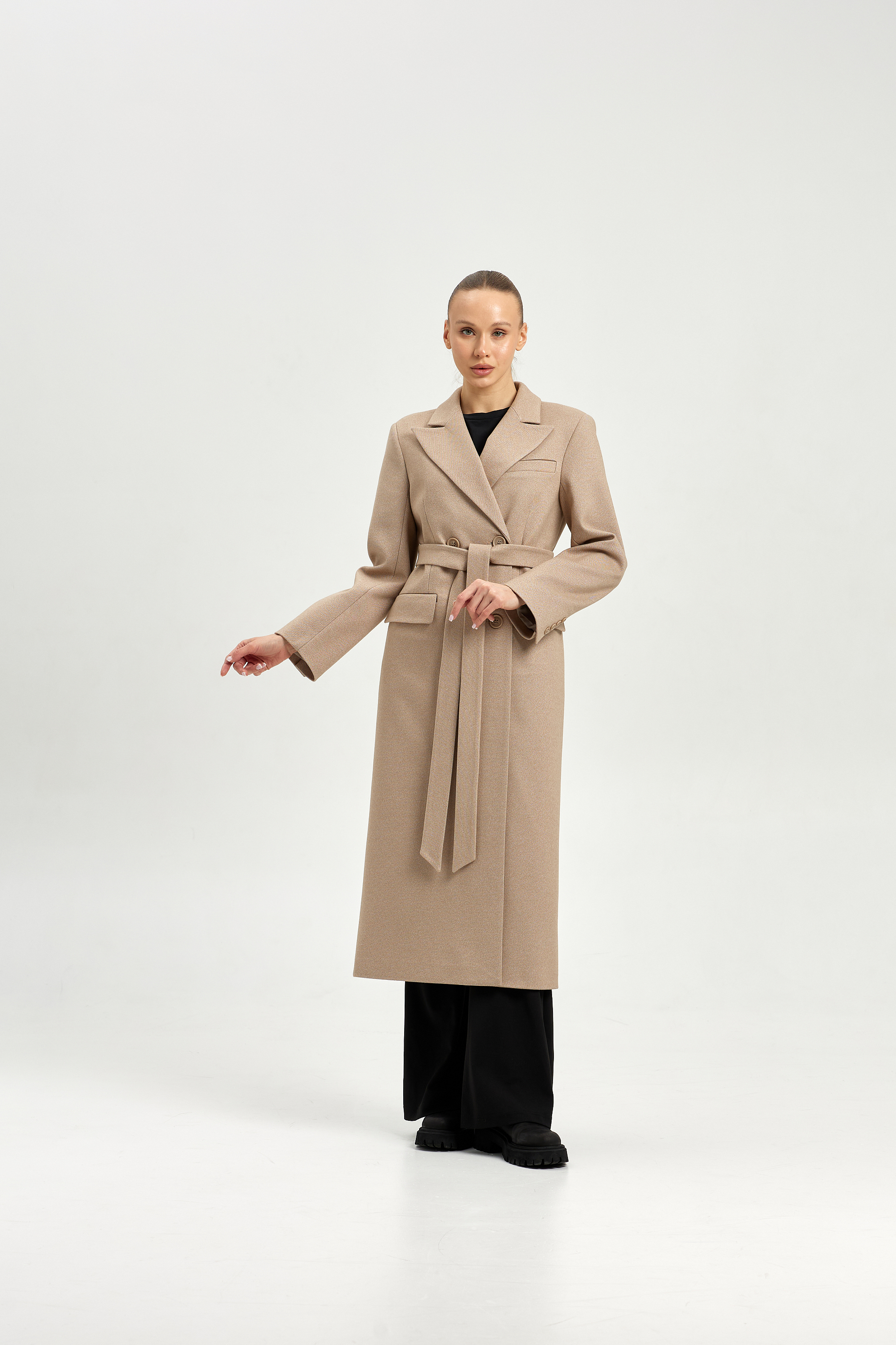 Пальто приталенного силуэта с втачным рукавом.