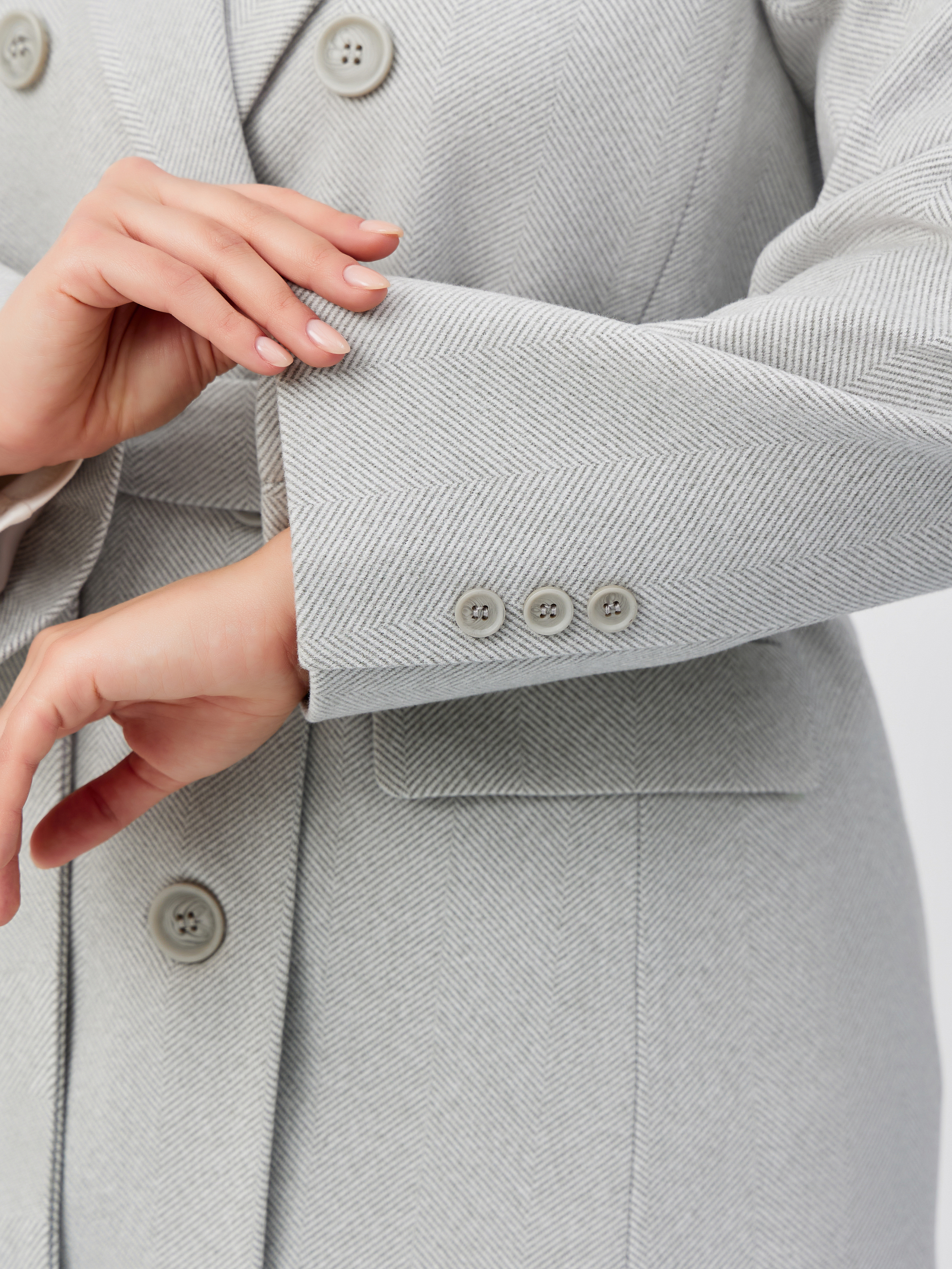 Застёжка -двубортная, ассиметричная с 6 пуговицами и 1 потайной.