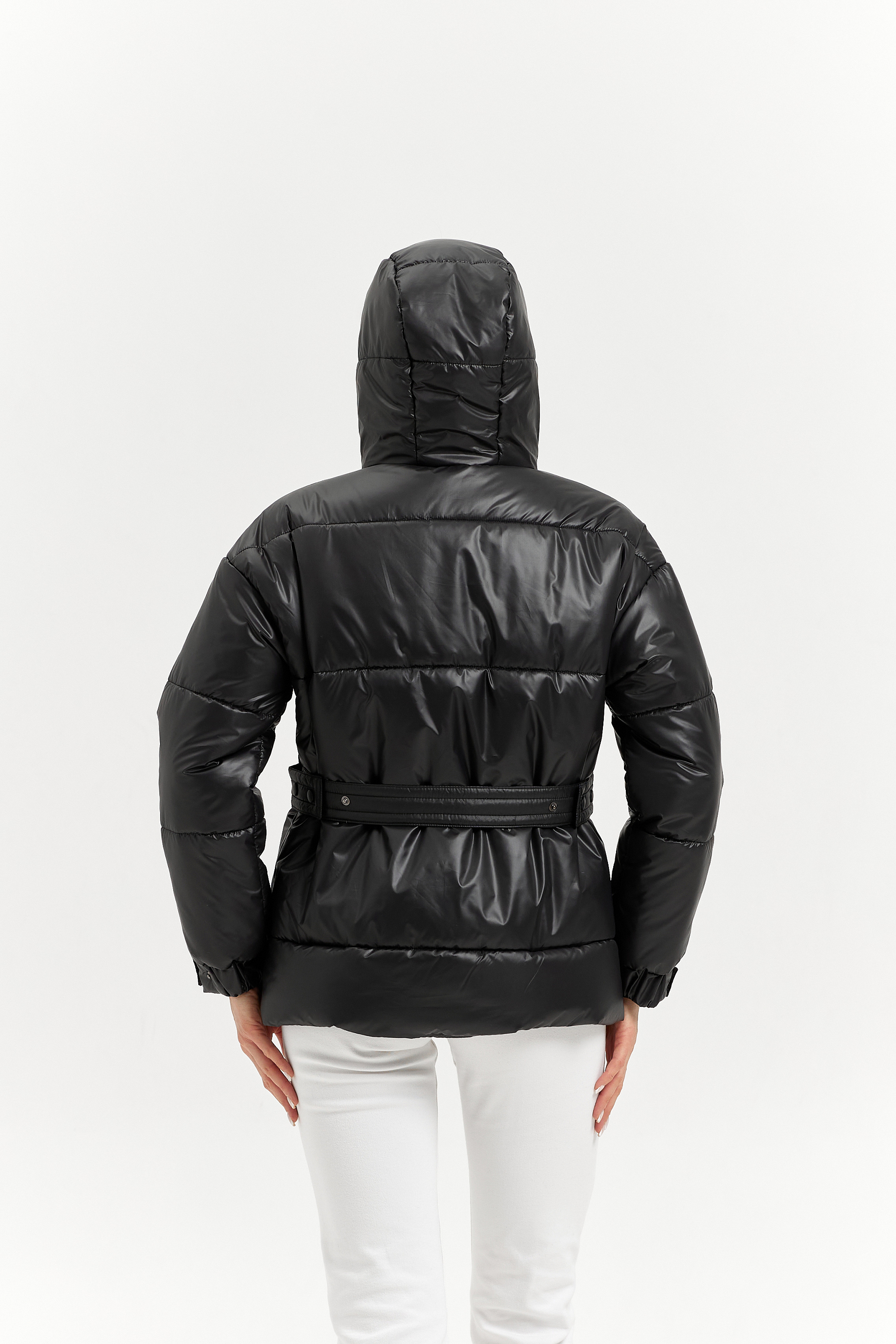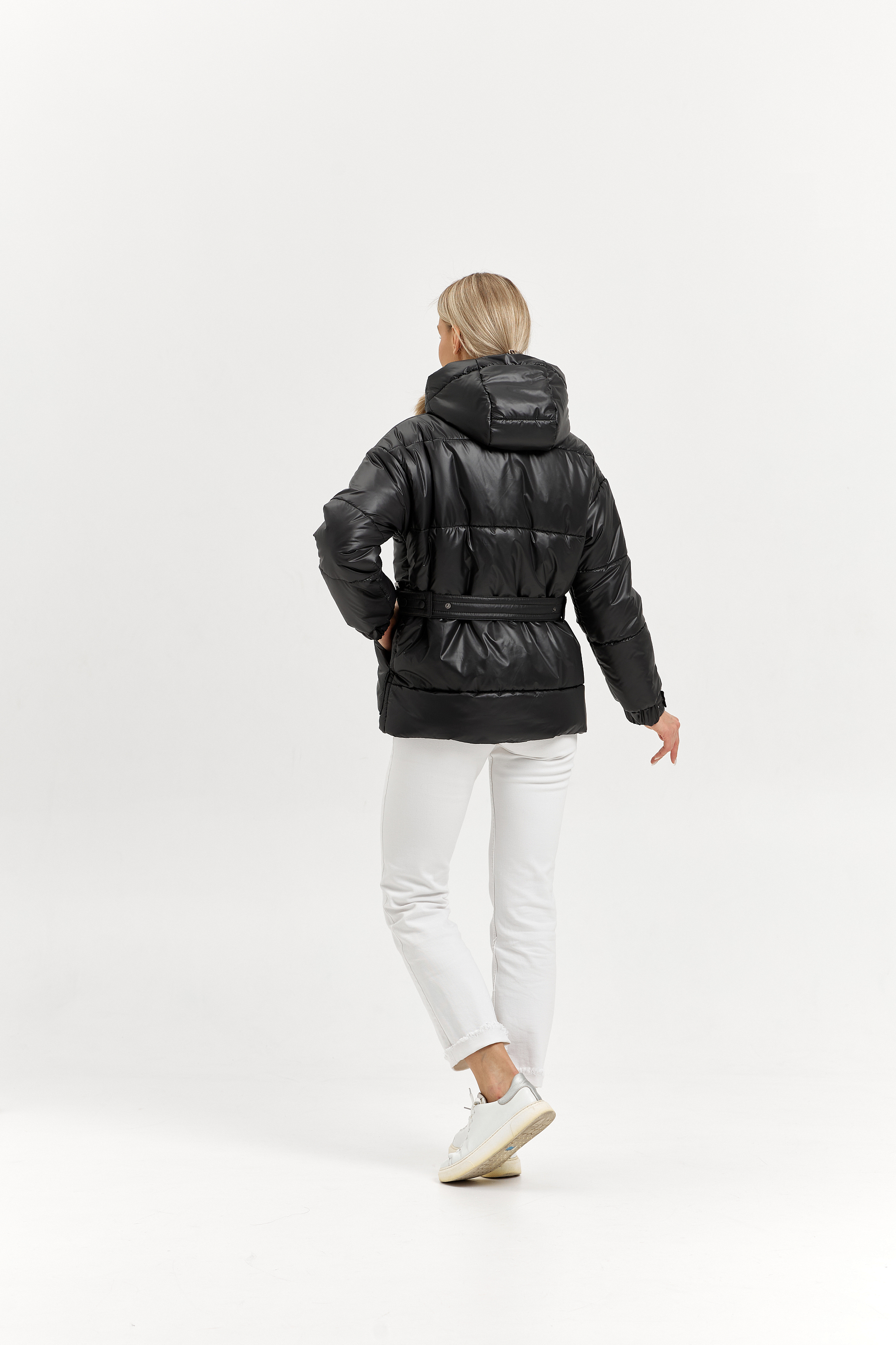 Пояс передний с пряжкой, выходит из-под кармана. Пояс спинки на кнопках регулирует объем талии.