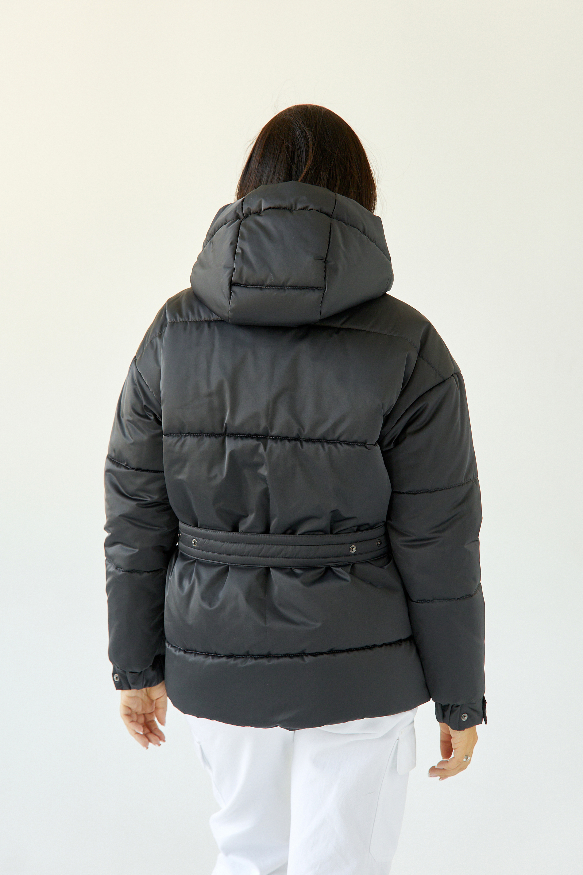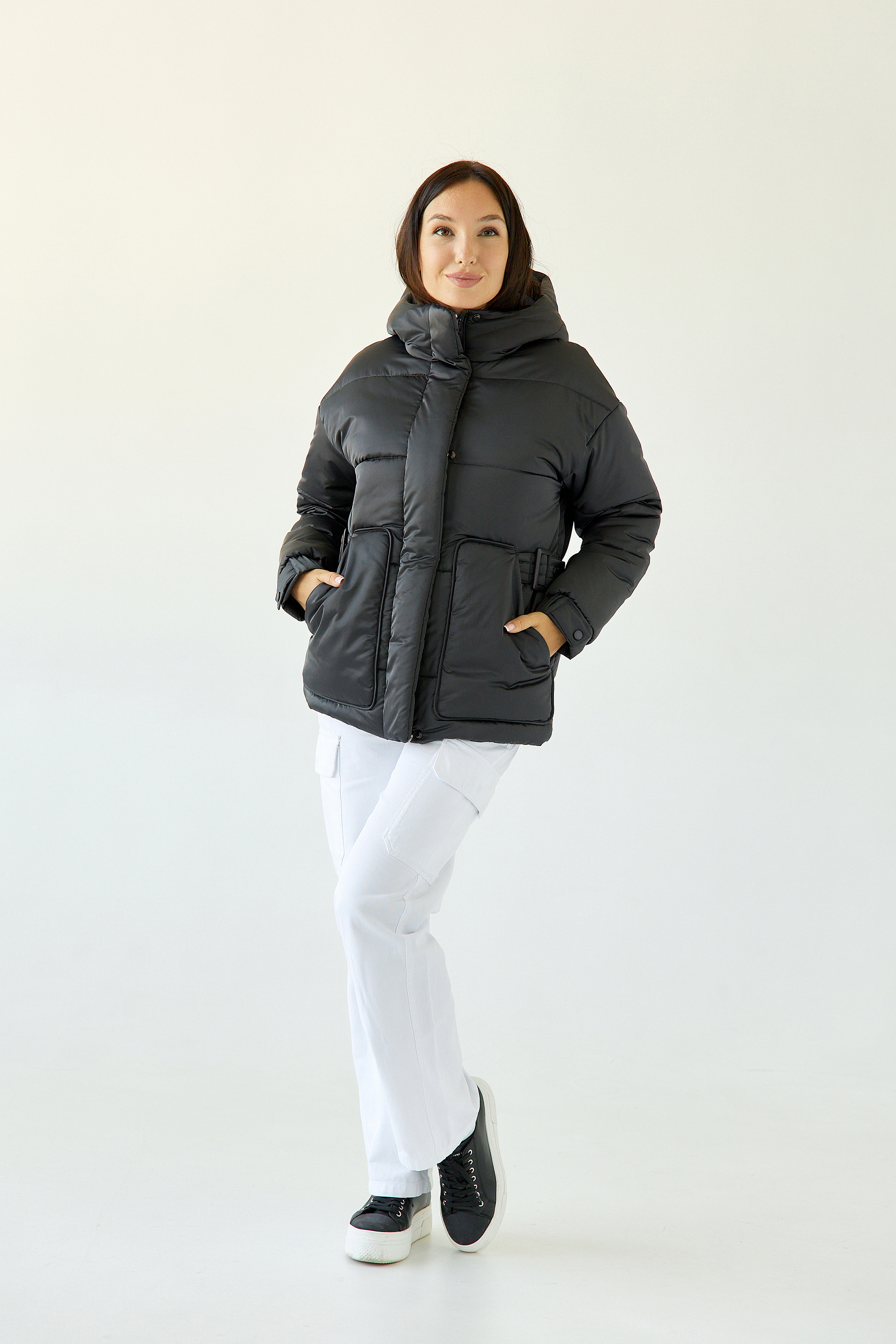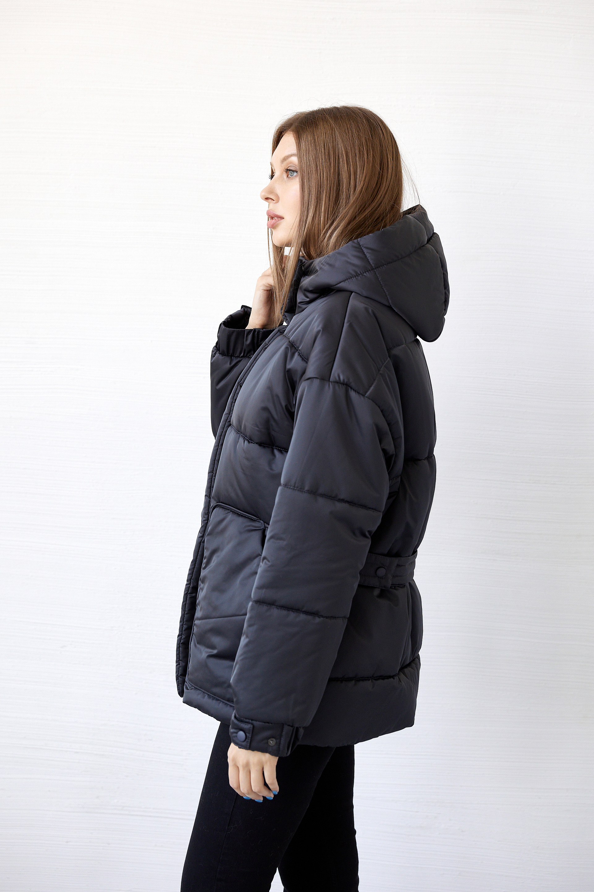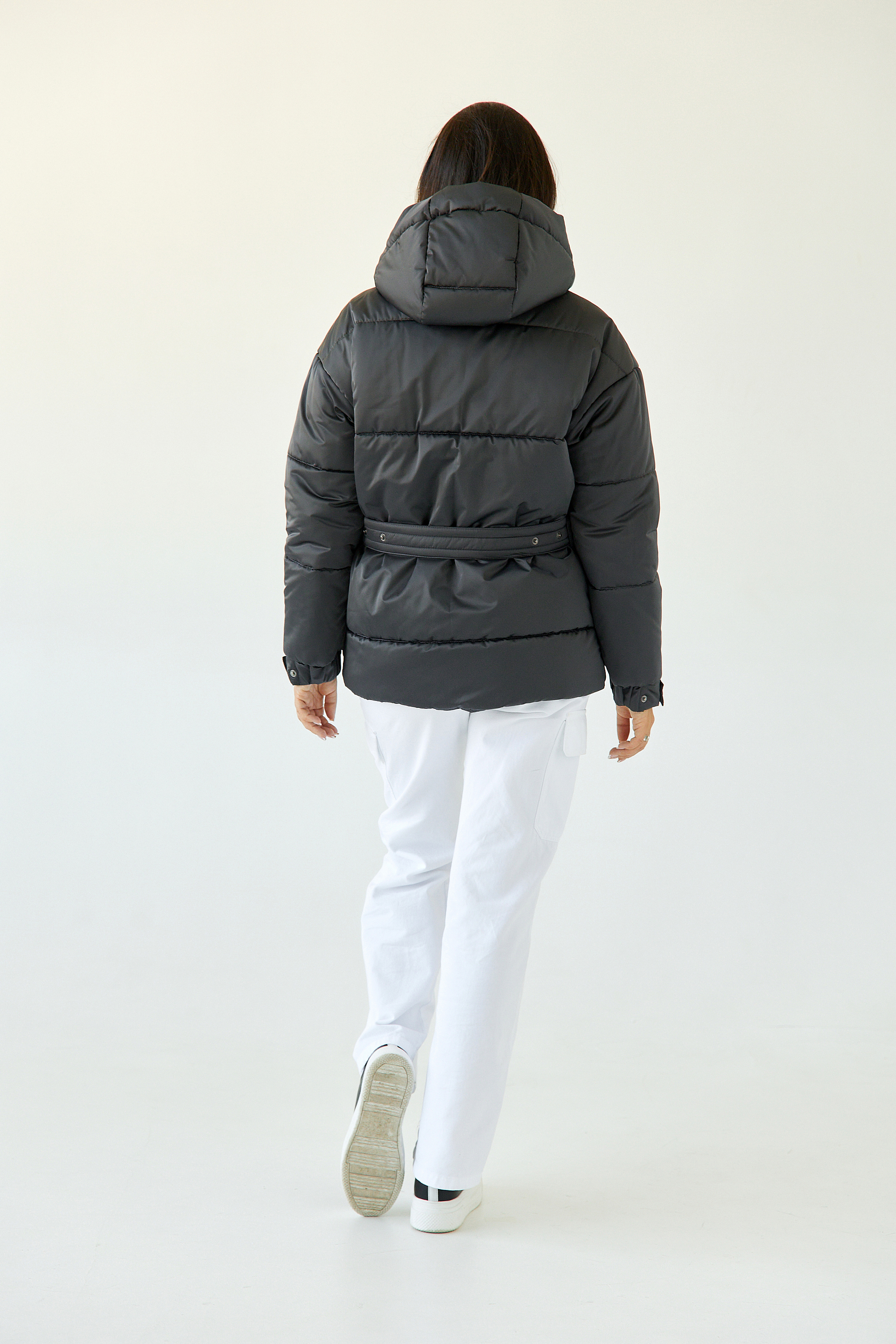 Пояс передний с пряжкой, выходит из-под кармана. Пояс спинки на кнопках регулирует объем талии.